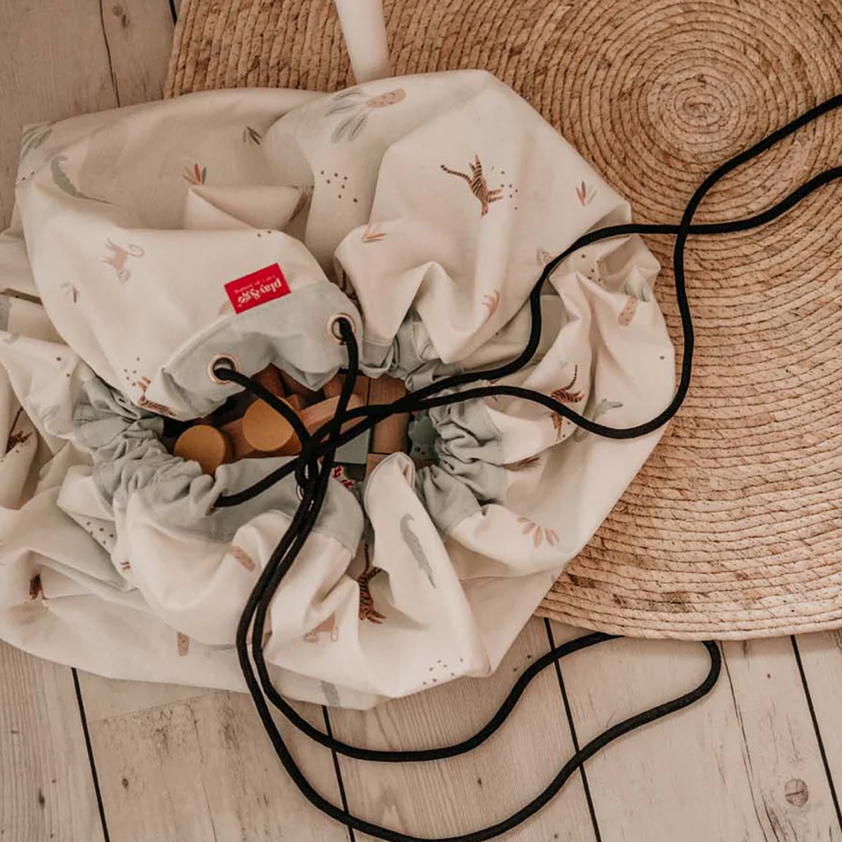 Σάκος και στρώμα παιχνιδιού σε λευκό χρώμα, πολύχρωμες λεπτομέρειες και σχέδιο ζούγκλα από την εταιρία Play&Go. Κατασκευασμένο από 80% βαμβάκι και 20% πολυεστέρα που το καθιστούν εξαιρετικά ανθεκτικό και μαλακό. Ο σάκος μπορεί να αποθηκεύσει μέσα παιχνίδια και διάφορα αντικείμενα ενώ παράλληλα μπορεί να γίνει και στρώμα για να παίζει το παιδί σας. Έχει ρυθμιζόμενα σχοινιά για να ανοίγει και να κλείνει εύκολα, να κρεμιέται παντού αλλά και για να το παίρνετε μαζί σας στα ταξίδια. Οι τσάντες Play & Go κατασκευάζονται σύμφωνα με τα πρότυπα παγκόσμιας περιβαλλοντικής διαχείρισης. Όλες οι τσάντες έχουν δοκιμαστεί επίσημα και εγκριθεί από την Swiss SGS και τη γερμανική TUV. Για καλύτερη διατήρηση των χρωμάτων, συνιστάται πλύσιμο στο χέρι.