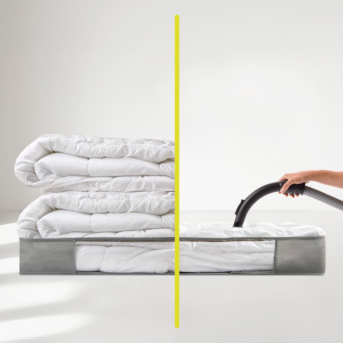 Θήκη φύλαξης που εσωτερικά διαθέτει σακούλα με σύστημα εξοικονόμησης αέρα για να προστατεύονται ρούχα, παπλώματα, κλπ, πιάνοντας λιγότερο χώρο. Χρησιμοποιήστε εύκολα και απλά την σκούπα σας και κερδίστε 4 φορές περισσότερο χώρο αποθήκευσης. Είναι κατασκευασμένη από 100% polyester και στην πάνω μεριά έχει ανθεκτικό φερμουάρ. Χρησιμοποιήστε την άφοβα για ογκώδη και εποχιακά ρούχα και προστατέψτε τα από σκόνη, υγρασία και ακάρεα. (Προσοχή: δεν συστήνεται για είδη από μετάξι και δέρμα, καθώς και είδη που περιέχουν πούπουλα ή φτερά) **Η βαλβίδα είναι κατάλληλη για όλες τις ηλεκτρικές σκούπες.**