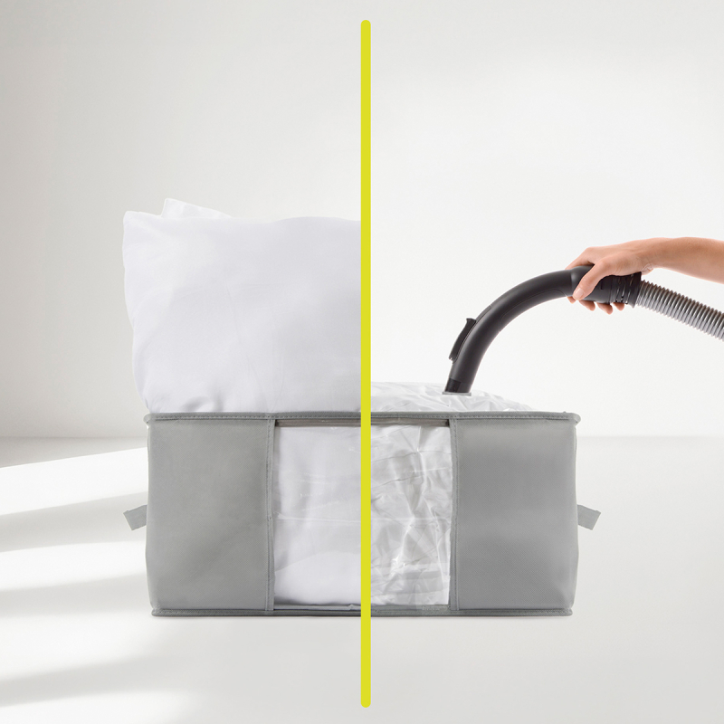Θήκη φύλαξης που εσωτερικά διαθέτει σακούλα με σύστημα εξοικονόμησης αέρα για να προστατεύονται ρούχα, παπλώματα, κλπ, πιάνοντας λιγότερο χώρο. Χρησιμοποιήστε εύκολα και απλά την σκούπα σας και κερδίστε 4 φορές περισσότερο χώρο αποθήκευσης. Είναι κατασκευασμένη από 100% polyester και στην πάνω μεριά έχει ανθεκτικό φερμουάρ. Χρησιμοποιήστε την άφοβα για ογκώδη και εποχιακά ρούχα και προστατέψτε τα από σκόνη, υγρασία και ακάρεα. (Προσοχή: δεν συστήνεται για είδη από μετάξι και δέρμα, καθώς και είδη που περιέχουν πούπουλα ή φτερά) **Η βαλβίδα είναι κατάλληλη για όλες τις ηλεκτρικές σκούπες.**