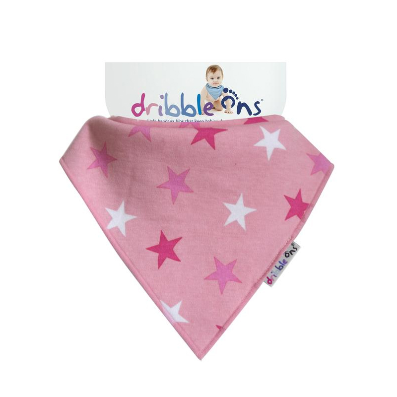 Σαλιάρα-μπαντάνα σε ροζ φόντο, φούξια-λευκές λεπτομέρειες και σχέδιο αστεράκια από την εταιρία Sock Ons. Η μπροστινή όψη είναι κατασκευασμένη από 100% βαμβάκι ενώ η πίσω είναι πετσετέ, από 84% βαμβάκι και 16% πολυεστέρα. Διαθέτει διπλό κλιπ για να ρυθμίζονται εύκολα. Αποτελεί την ιδανική λύση κατά την περίοδο της οδοντοφυΐας, για να μην λερώνουν τα ρουχαλάκια τους με τα σάλια. Ιδανική σαλιάρα για προστασία και στυλ.