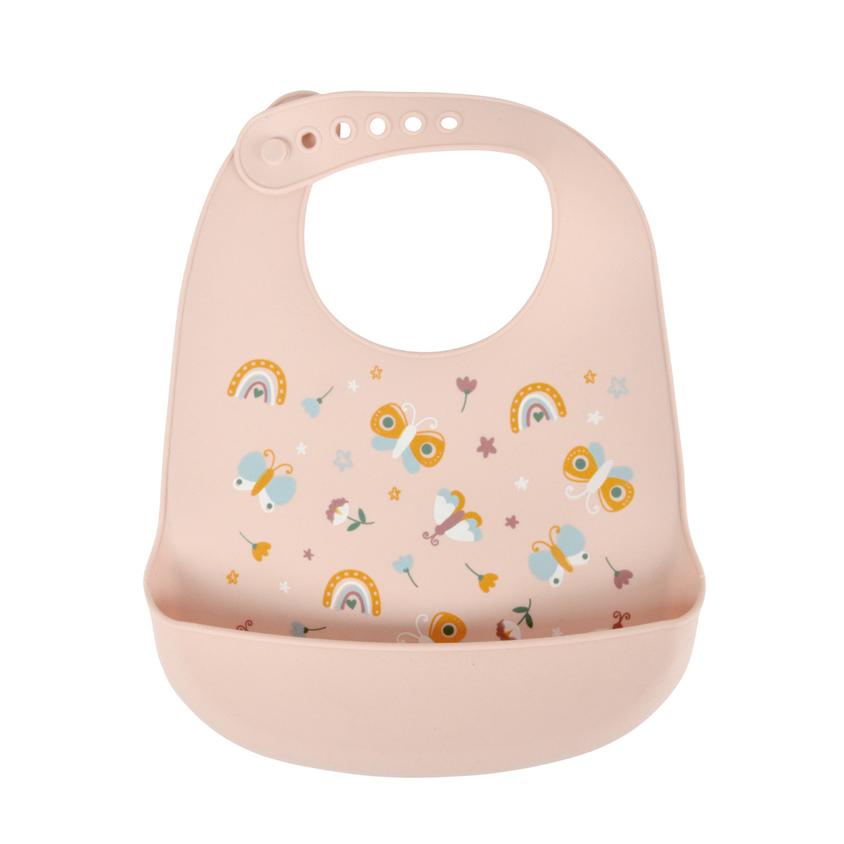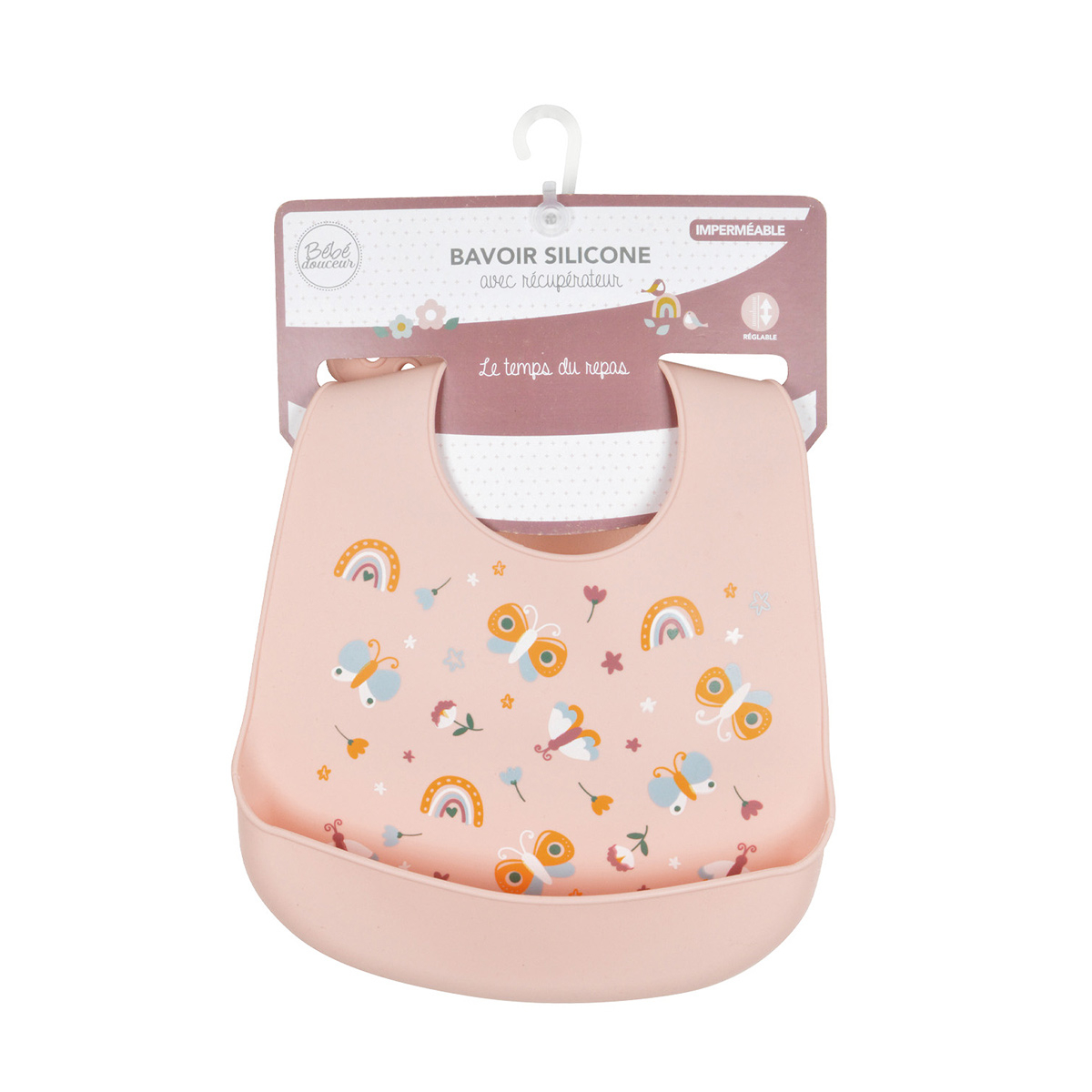 Σαλιάρα σιλικόνης σε ροζ χρώμα με πεταλουδίτσες. Διαθέτει θήκη για να μην πέφτουν τροφές και ψίχουλα στο πάτωμα και να παραμένουν τα ρούχα καθαρά. Είναι κατασκευασμένη από απαλή και ελαφριά σιλικόνη. Έχει ρυθμιζόμενο κούμπωμα στο λαιμό για άνετη εφαρμογή. Κατάλληλη για βρέφη 6 μηνών και άνω. Συνδυάστε τη με τα υπόλοιπα είδη της ίδιας συλλογής για ένα ολοκληρωμένο αποτέλεσμα.