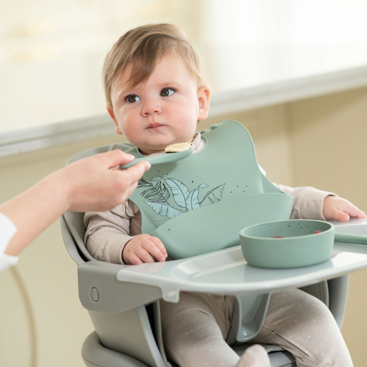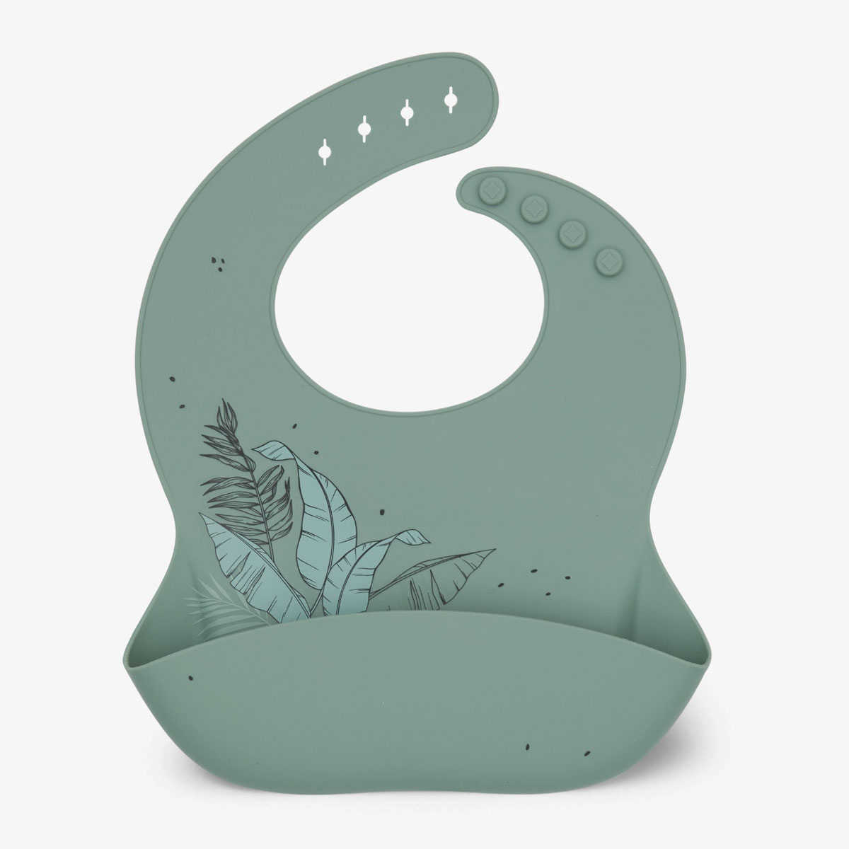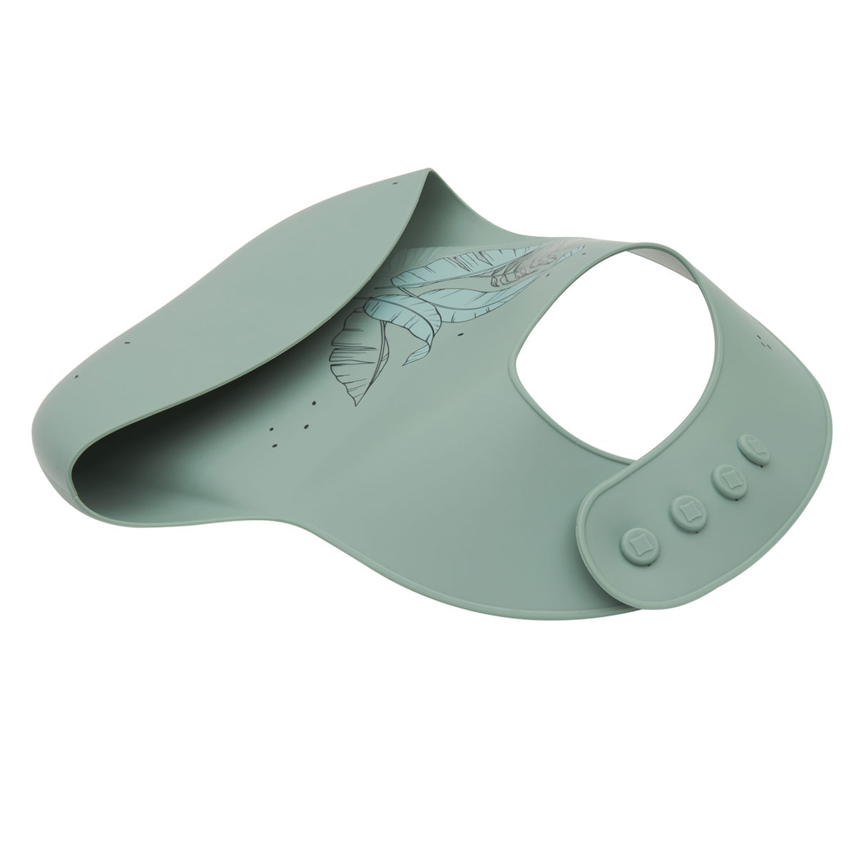 Σαλιάρα σιλικόνης από την εταιρία Kikka Boo σε πράσινο χρώμα με φλοράλ σχέδιο. Είναι κατασκευασμένη από πλατινένια σιλικόνη απαλλαγμένη από BPA. Η ποιότητά της, της επιτρέπει να αντέχει σε θερμοκρασίες από -40°C έως 230°C. Επίσης, είναι μαλακό, εύκαμπτο και άοσμο υλικό. Διαθέτει θήκη για να μην πέφτουν τροφές και ψίχουλα στο πάτωμα και να διατηρούνται τα ρούχα καθαρά. Με ρυθμιζόμενο κούμπωμα στο λαιμό για άνετη εφαρμογή. Κατάλληλη για βρέφη 6 μηνών και άνω.