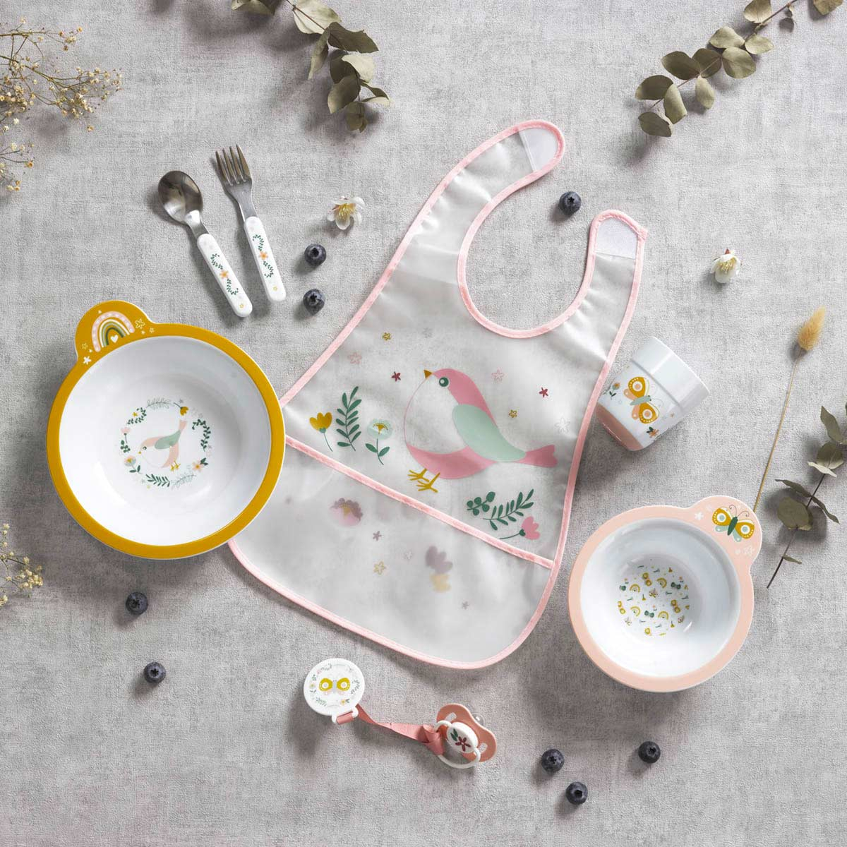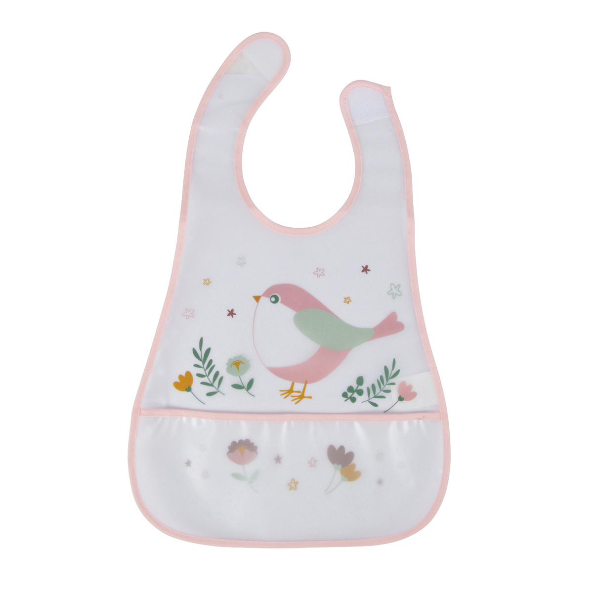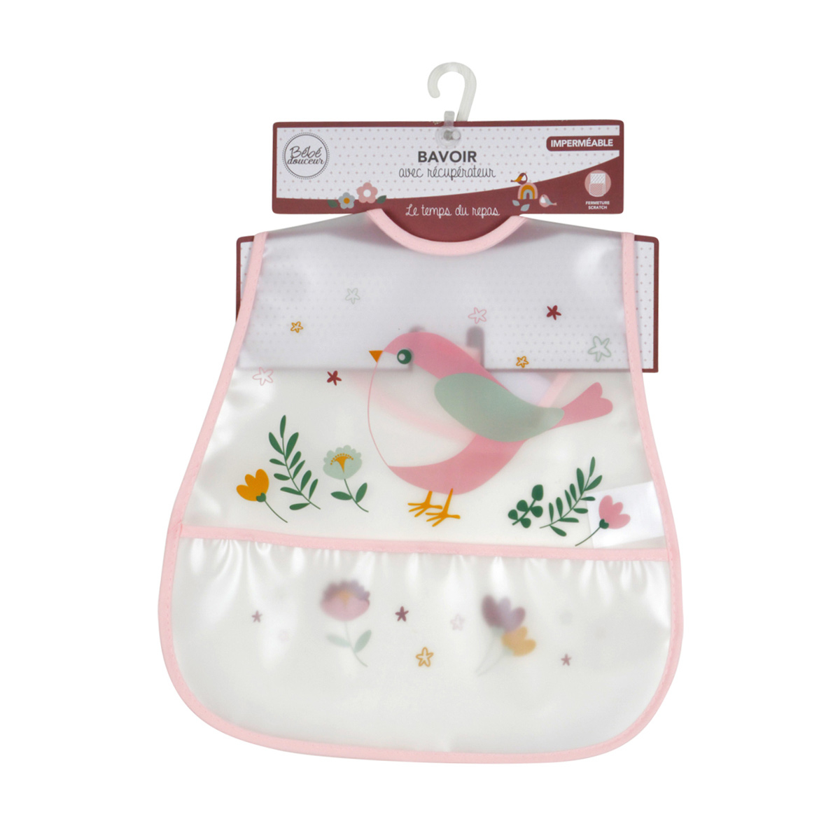 Αδιάβροχη σαλιάρα, διάφανη με ροζ λεπτομέρειες και χαρούμενο σχέδιο με πουλάκι. Είναι κατασκευασμένη από βαμβάκι και PEVA υλικό, που καθαρίζεται απλά με σφουγγάρι και νερό. Κλείνει και ανοίγει εύκολα με velcro. Είναι πρακτική, καθαρίζεται εύκολα και είναι ιδανική για προστασία από ανεπιθύμητους λεκέδες. Συνδυάστε τη με τα υπόλοιπα είδη της ίδιας συλλογής για ένα ολοκληρωμένο αποτέλεσμα.
