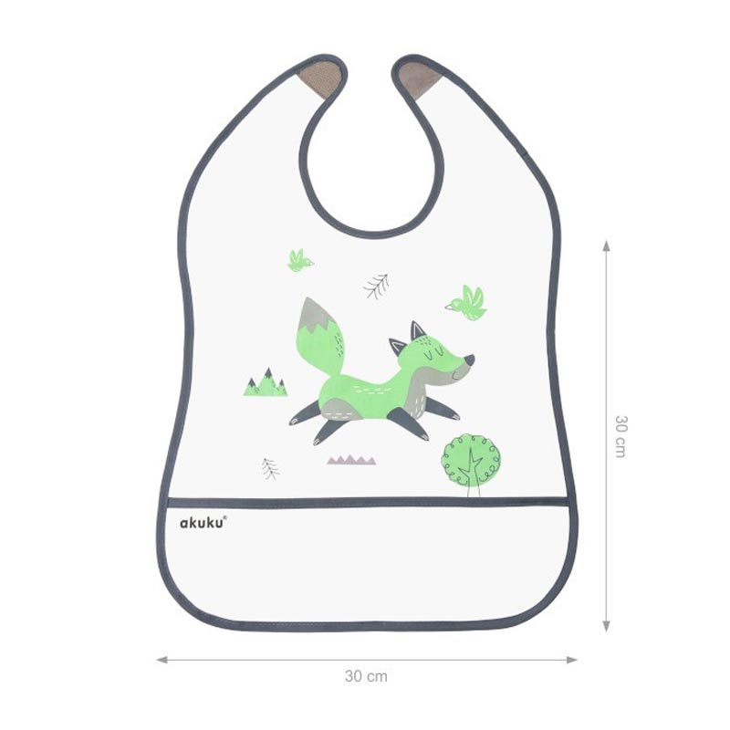 Αδιάβροχη σαλιάρα σε πράσινο-διάφανο χρώμα και σχέδιο αλεπού από την εταιρία Akuku. Είναι κατασκευασμένη από 100% υλικό EVA, που καθαρίζεται απλά με ένα βρεγμένο πανί. Διαθέτει μικρή τσέπη στο μπροστινό μέρος για την περισυλλογή ψίχουλων, ενώ κλείνει με velcro για να εύκολο άνοιγμα και κλείσιμο. Είναι πρακτική, καθαρίζεται εύκολα και ιδανική για να προστατεύσει τα ρουχαλάκια του μωρού σας από ανεπιθύμητους λεκέδες.