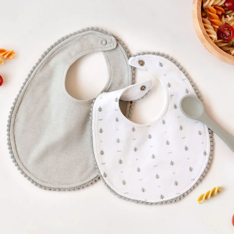 Βρεφικές σαλιάρες σετ 2τμχ για το μωρού σας σε ροζ-λευκό χρώμα, με γκρι λεπτομέρειες και μοντέρνο σχέδιο από την εταιρεία Kiokids. Στο σετ περιλαμβάνεται και 1 κουτάλι φαγητού κατασκευασμένο από σιλικόνη σε γκρι χρώμα. Οι σαλιάρες είναι κατασκευασμένες από 100% βαμβάκι. Διαθέτουν γκρι διακοσμητικό περιμετρικό ρέλι. Ιδανικές για να κρατάνε καθαρό και στεγνό το μωρό σας κατά τη διάρκεια των γευμάτων και ολόκληρης της ημέρας. Ιδανικό σετ για τα γεύματα του μωρού σας.