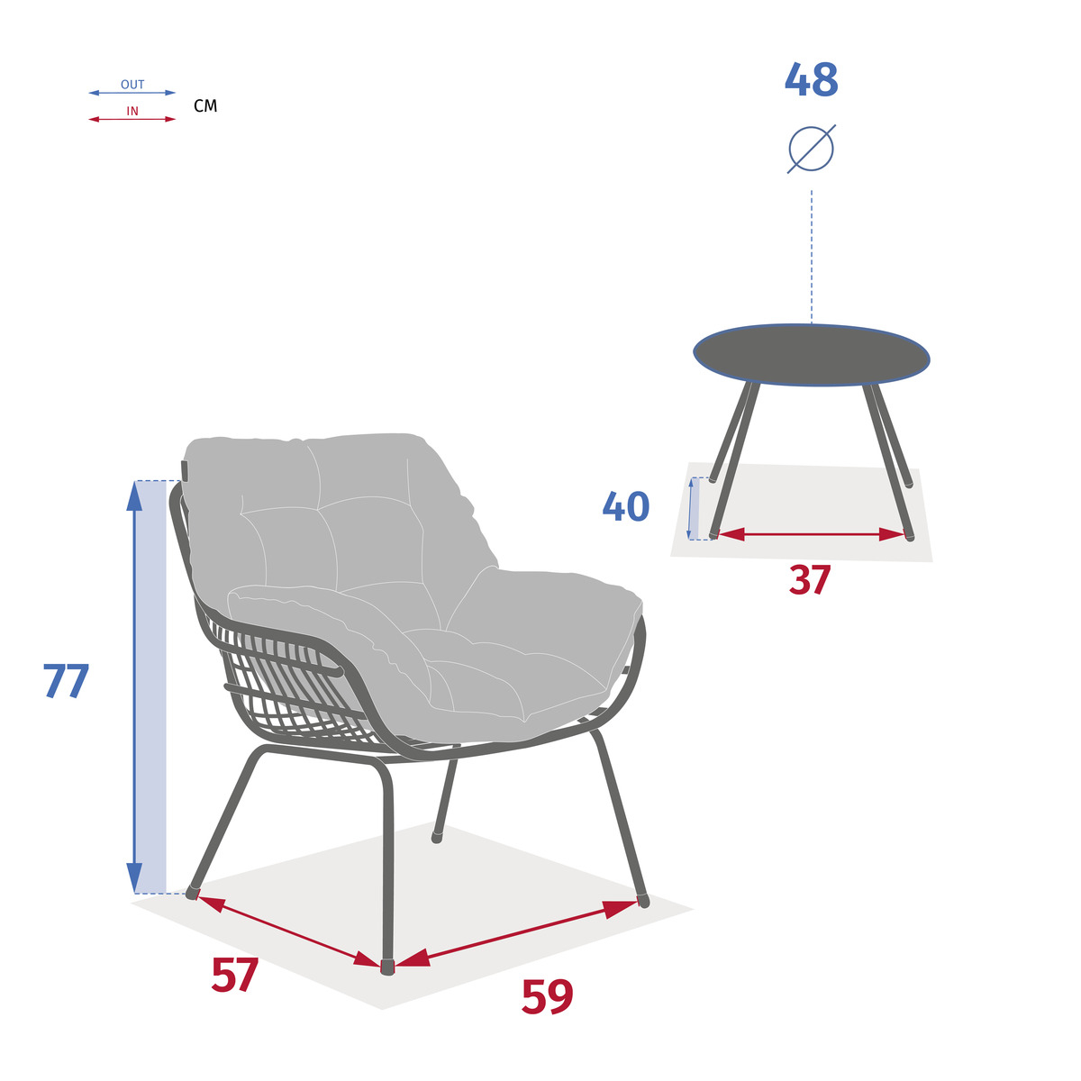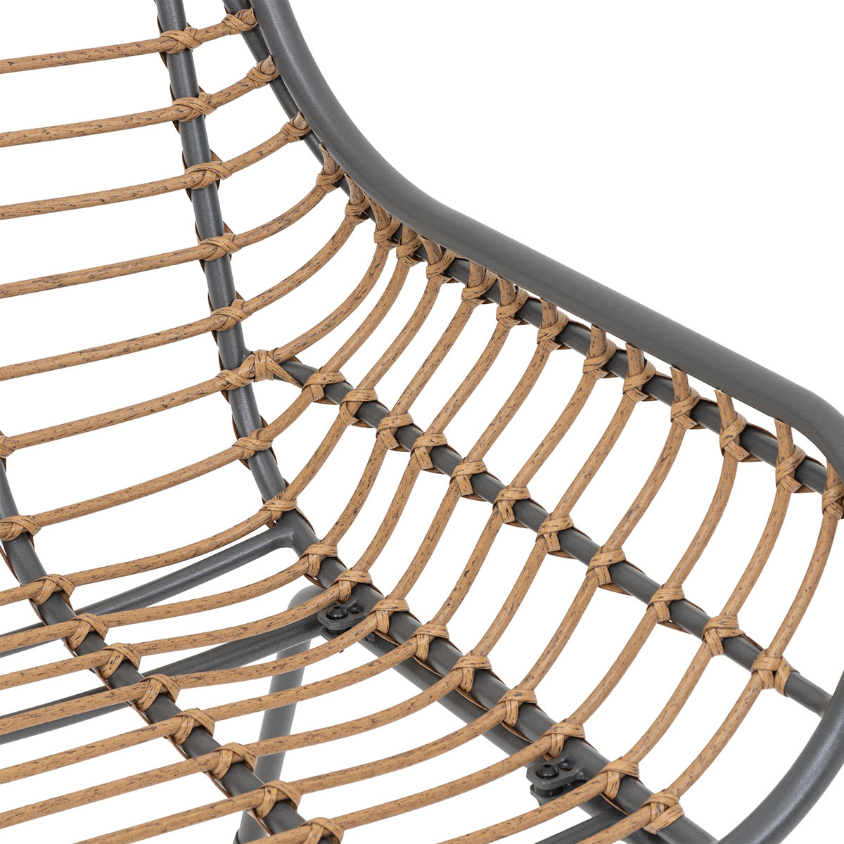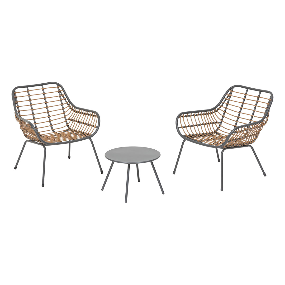 Σετ σαλονιού εξωτερικού χώρου σε γκρι αποχρώσεις με λεπτομέρειες από ρατάν. Το σετ διαθέτει άνετες πολυθρόνες με αφράτα μαξιλάρια για ατελείωτες ώρες χαλάρωσης και ξεκούρασης στην βεράντα ή τον κήπο και στρογγυλό τραπεζάκι. Είναι κατασκευασμένα από ανθεκτικά υλικά που αποτρέπουν την οξείδωση και τη διάβρωση και την σκουριά. Με μοντέρνο και διαχρονικό σχεδιασμό, ταιριάζει απόλυτα σε κάθε είδος εξωτερικού χώρου και ταυτόχρονα προσφέρει άνεση.