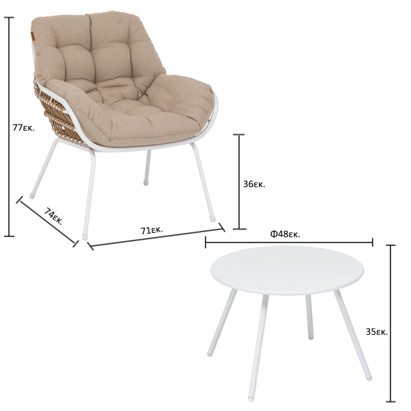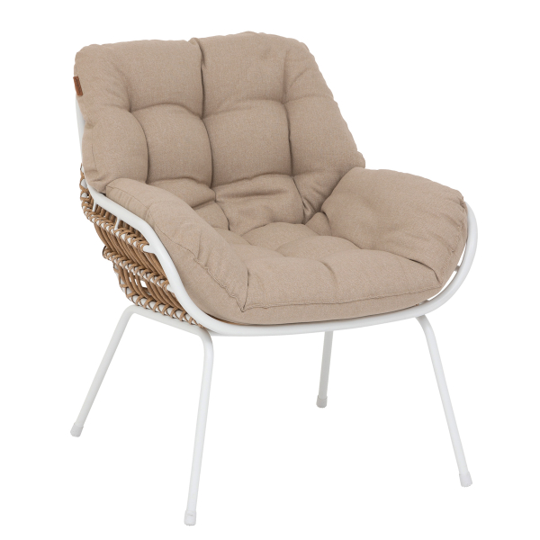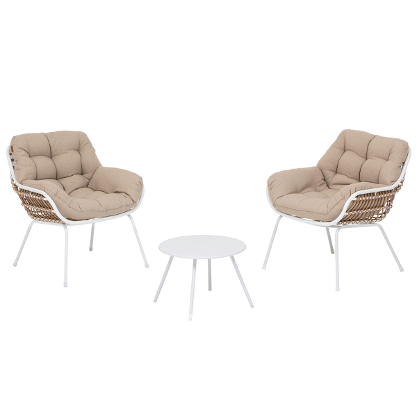 Σετ σαλονιού εξωτερικού χώρου με λευκό σκελετό λεπτομέρειες από ρατάν. Το σετ διαθέτει άνετες πολυθρόνες με αφράτα μαξιλάρια σε μπεζ χρώμα για ατελείωτες ώρες χαλάρωσης και ξεκούρασης στην βεράντα ή τον κήπο και στρογγυλό τραπεζάκι. Είναι κατασκευασμένα από ανθεκτικά υλικά που αποτρέπουν την οξείδωση και τη διάβρωση και την σκουριά. Με μοντέρνο και διαχρονικό σχεδιασμό, ταιριάζει απόλυτα σε κάθε είδος εξωτερικού χώρου και ταυτόχρονα προσφέρει άνεση.