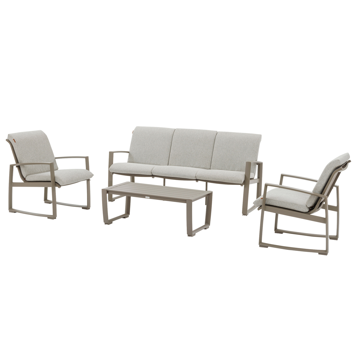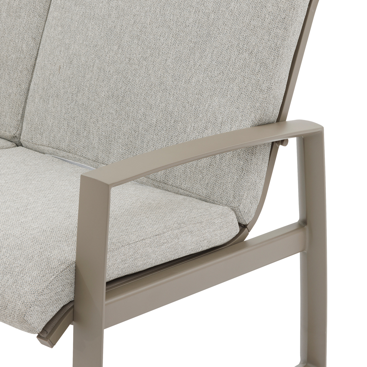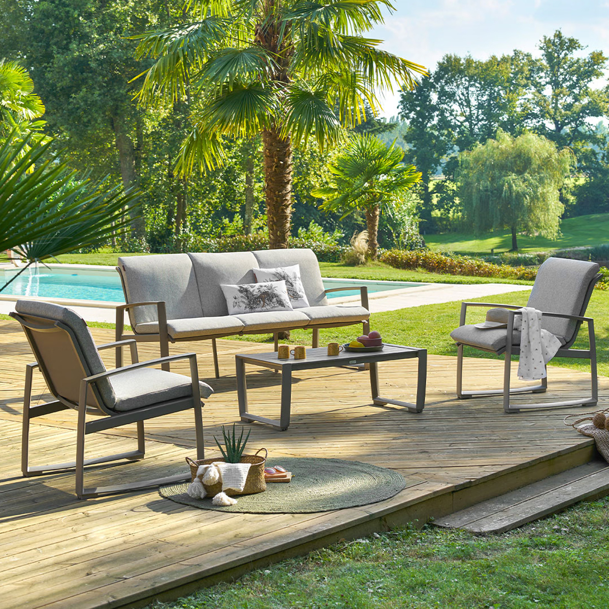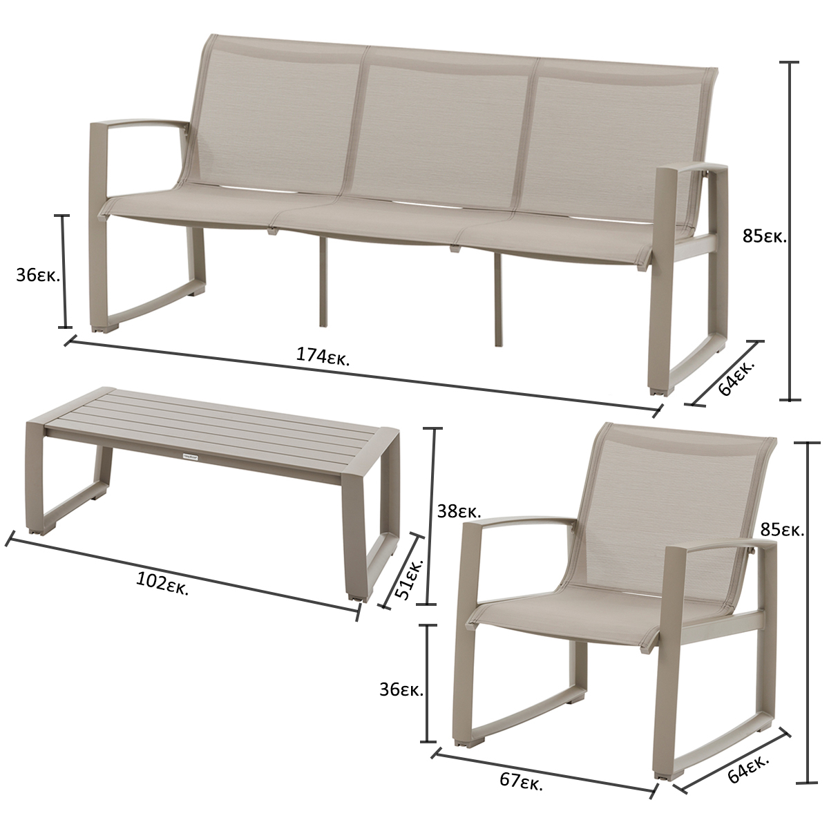 Σετ σαλονιού εξωτερικού χώρου με γκρι-μπεζ σκελετό. Είναι κατασκευασμένα από ανθεκτικά υλικά, με ειδική επεξεργασία που αποτρέπει την οξείδωση, τη διάβρωση και την σκουριά. Τα αφράτα μαξιλάρια και ο εργονομικός σχεδιασμός προσφέρουν ατελείωτες ώρες χαλάρωσης και ξεκούρασης. Το αδιάβροχο επεξεργασμένο ύφασμα, επιτρέπει στο νερό να γλιστράει χωρίς να διεισδύει στο υλικό. Ιδανικό για την βεράντα ή τον κήπο.