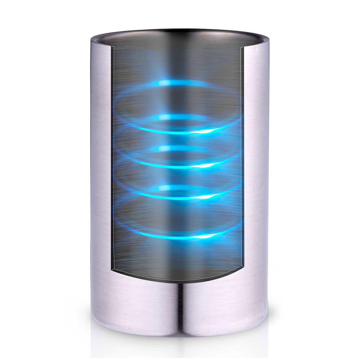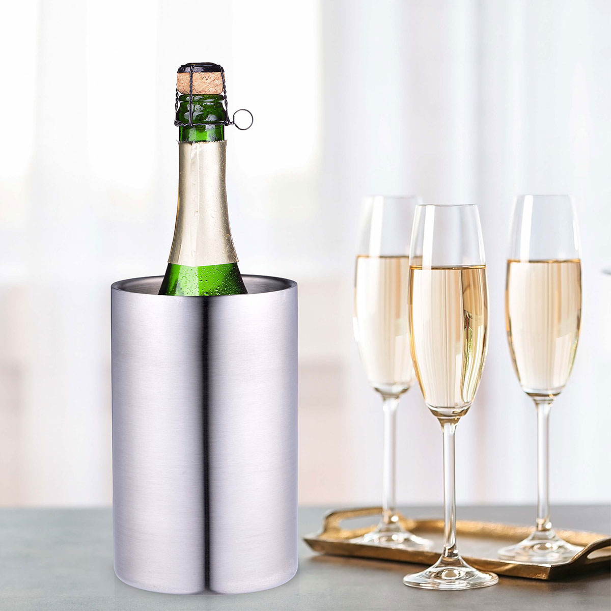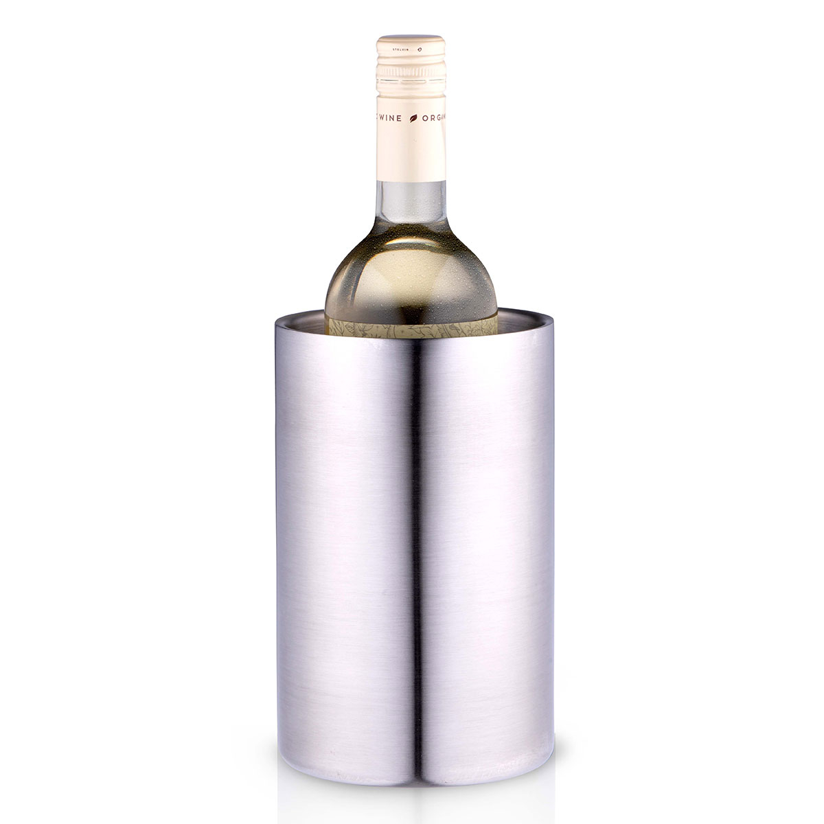 Θήκη μπουκαλιού κατασκευασμένη από ανοξείδωτο ατσάλι σε ασημί χρώμα. Διαθέτει διπλό τοίχωμα για να διατηρεί τη θερμοκρασία της φιάλης. Ιδανική για μπουκάλια κρασιού και σαμπάνιας.