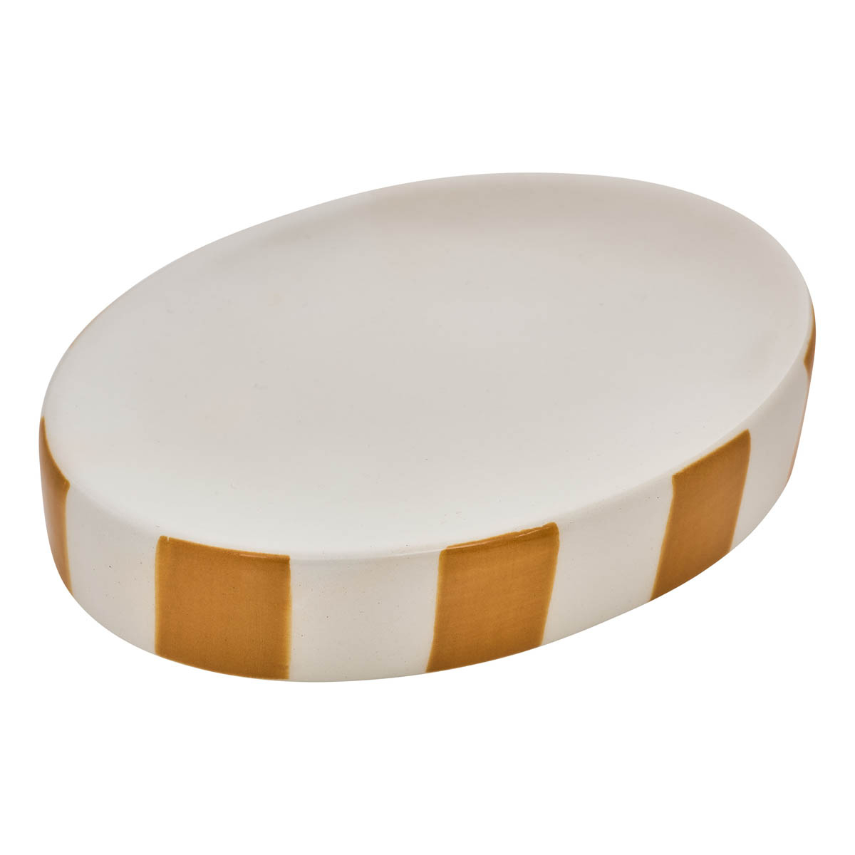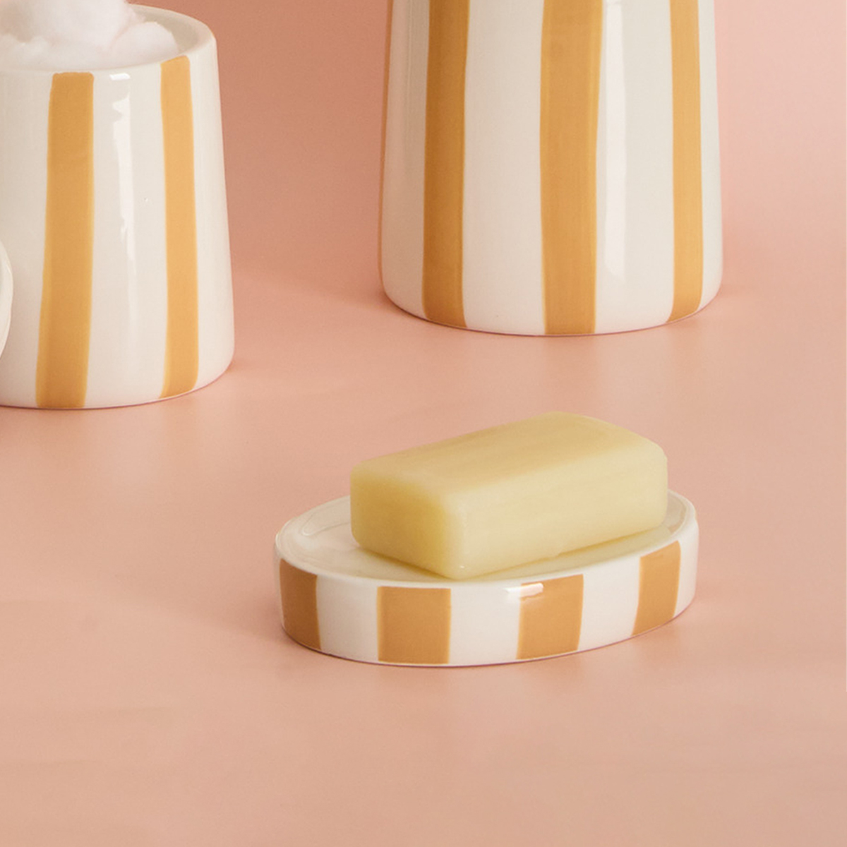 Σαπουνοθήκη με ριγέ σχέδιο σε κίτρινο και λευκό χρώμα. Είναι κεραμική, κατασκευασμένη από δολομίτη. Συνδυάστε την με τα υπόλοιπα προϊόντα του ίδιου σετ για μία ολοκληρωμένη διακόσμηση στο μπάνιο σας.