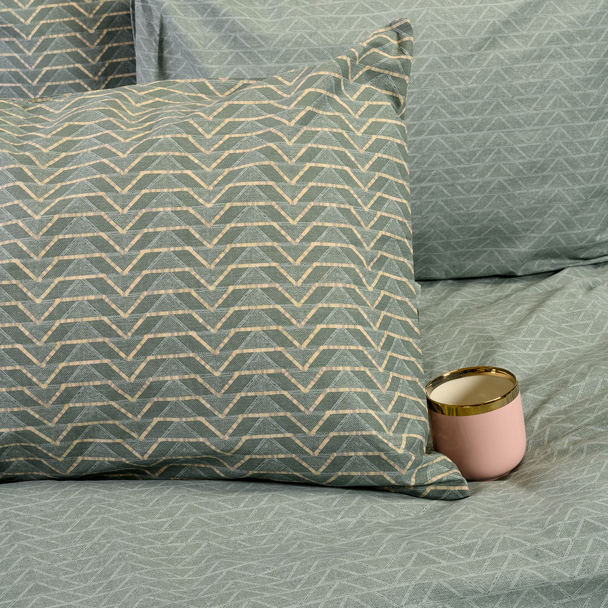 Σεντόνια διπλά της εταιρείας Melinen σε πράσινες αποχρώσεις με μπεζ λεπτομέρειες και γεωμετρικό σχέδιο. Κατασκευασμένα από 100% βαμβάκι 144 κλωστών, απαλό και ανθεκτικό. Υπάρχει επιλογή κατωσέντονου χωρίς λάστιχο ή με λάστιχο περιμετρικά. Στο σετ περιλαμβάνονται 2 μαξιλαροθήκες φάκελος με το σχέδιο του πανωσέντονου. Συνδυάστε τα με τα υπόλοιπα είδη της ίδιας σειράς για ένα ολοκληρωμένο αποτέλεσμα.