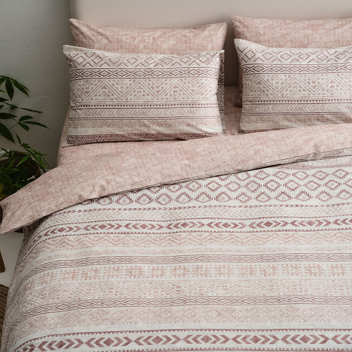 Σεντόνια διπλά σετ σε εκρού φόντο, με λεπτομέρειες σε χρώμα σάπιο μήλο και έθνικ σχέδιο από την εταιρία Vesta Home. Είναι κατασκευασμένα από 100% βαμβάκι 144 κλωστών, που τα καθιστά ανθεκτικά και απαλά. Στο σετ περιλαμβάνονται οι μαξιλαροθήκες φάκελος με το σχέδιο του πανωσέντονου.**Το σχέδιο στις μαξιλαροθήκες ενδέχεται να διαφέρει από αυτό της φωτογραφίας, καθώς η εταιρεία παράγει μαξιλαροθήκες από όλο το σχέδιο του υφάσματος και τις συσκευάζει με τυχαία σειρά.** Διατίθεται σε υφασμάτινη θήκη. Συνδυάστε τα με τα υπόλοιπα είδη της ίδιας σειράς για ένα ολοκληρωμένο αποτέλεσμα.