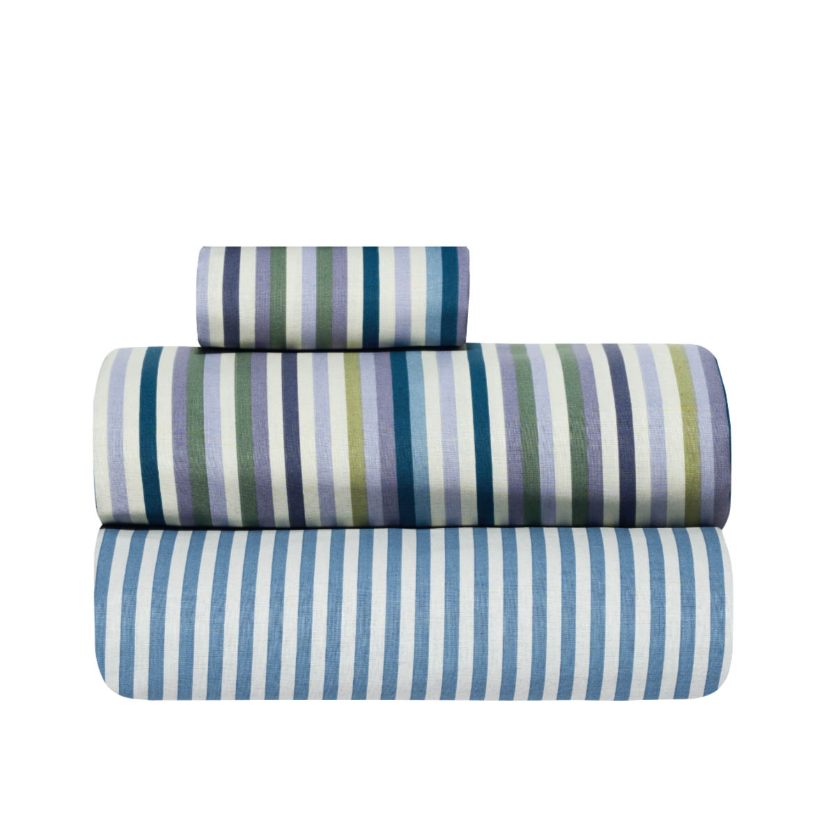Σετ ημίδιπλα σεντόνια από την εταιρεία Kentia με ριγέ σχέδιο σε μπλε-γκρι αποχρώσεις και πράσινες-εκρού λεπτομέρειες. Το ύφασμα είναι 100% βαμβάκι 150 κλωστών που προσφέρει απαλότητα και ανθεκτικότητα. Το κατωσέντονο έχει ριγέ σχέδιο σε λευκό-μπλε χρώμα. Η μαξιλαροθήκη είναι φάκελος και έχει το σχέδιο του πανωσέντονου. Συνδυάστε τα με τα υπόλοιπα προϊόντα του ίδιου σετ για ένα ολοκληρωμένο αποτέλεσμα.**Το σχέδιο στην μαξιλαροθήκη ενδέχεται να διαφέρει από αυτό της φωτογραφίας καθώς η εταιρεία παράγει μαξιλαροθήκες από όλο το σχέδιο του υφάσματος και τις συσκευάζει με τυχαία σειρά. **