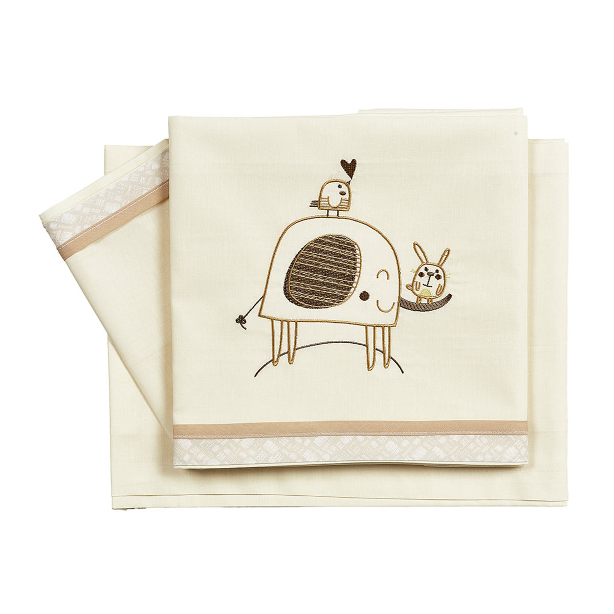 Βρεφικά σεντόνια για την κούνια της εταιρείας Κόσμος του Μωρού σε μπεζ χρώμα με κεντητό σχέδιο ελεφαντάκι και ρέλι. Το ύφασμα είναι 100% βαμβακερό που προσφέρει απαλότητα και ανθεκτικότητα.