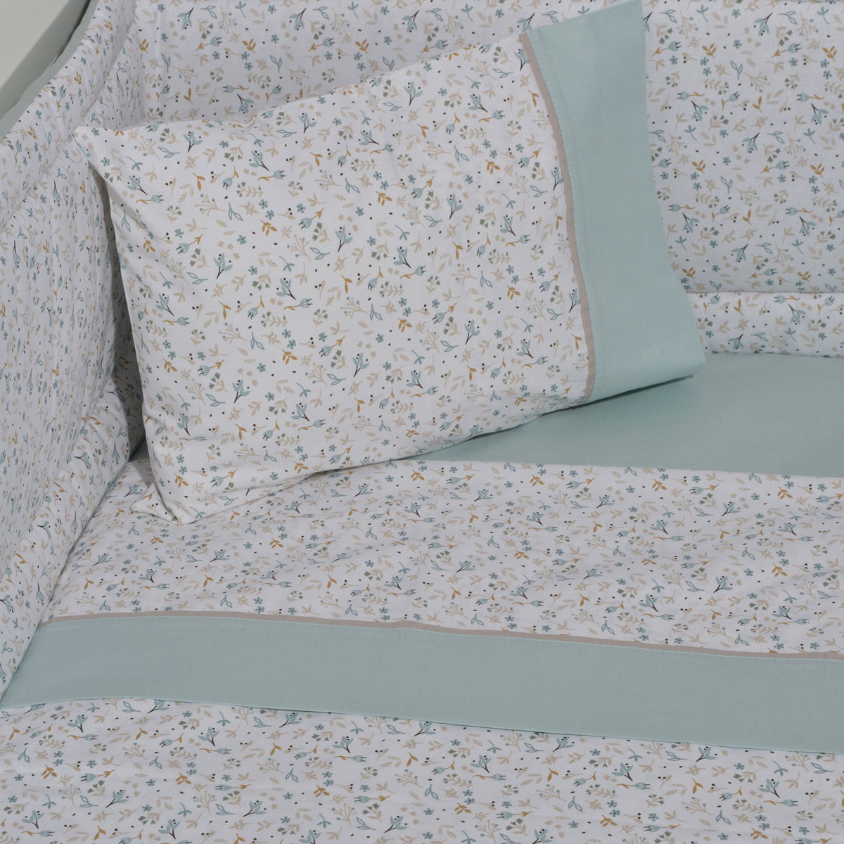 Βρεφικά σεντόνια σετ για την κούνια του μωρού από την εταιρεία Baby Oliver. To πανωσέντονο έχει λευκό χρώμα με φλοράλ σχέδιο σε απόχρωση μέντας και λευκή φάσα. Το κατωσέντονο είναι μονόχρωμο σε χρώμα μέντας. Το ύφασμα είναι 100% βαμβάκι 144 κλωστών με πιστοποίηση Oekotex που εγγυάται ότι τα υφάσματα δεν έχουν επιβλαβείς ουσίες. Στο σετ περιλαμβάνεται μια μαξιλαροθήκη φάκελος στο σχέδιο του πανωσέντονου με φάσα στο χρώμα της μέντας. Σε συσκευασία κουτί. Συνδυάστε τα με τα υπόλοιπα είδη του ίδιου σχεδίου για ένα ολοκληρωμένο αποτέλεσμα.