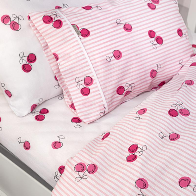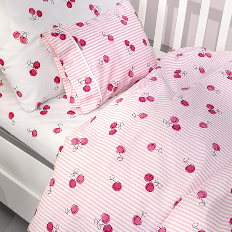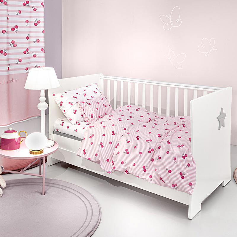 Σεντόνια κούνιας σετ με σχέδιο κεράσια σε ροζ χρώμα με γκρι-φούξια λεπτομέρειες από την εταιρεία Guy Laroche. Είναι κατασκευασμένα από 100% βαμβάκι 144 κλωστών που τα καθιστά ιδιαιτέρα απαλά και κατάλληλα για το βρεφικό δερματάκι. Το κατωσέντονο έχει σχέδιο κεράσια σε λευκό-ροζ χρώμα. Στο σετ περιλαμβάνεται και η μαξιλαροθήκη με φάσα με το σχέδιο του πανωσέντονου. Συνδυάστε τα με τα υπόλοιπα προϊόντα του ίδιου σχεδίου για ένα ολοκληρωμένο αποτέλεσμα στο βρεφικό δωμάτιο.