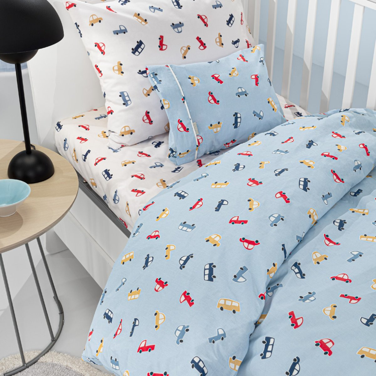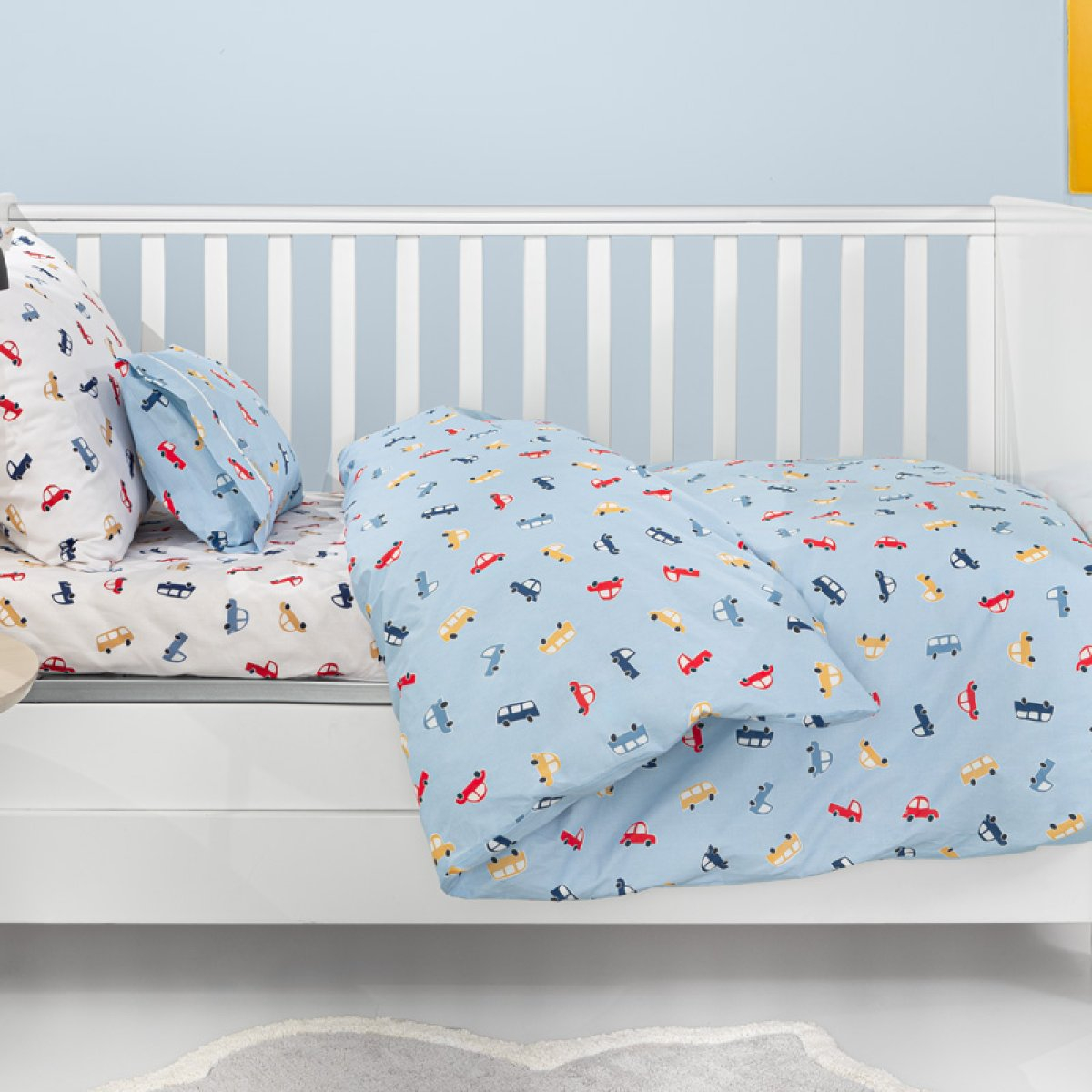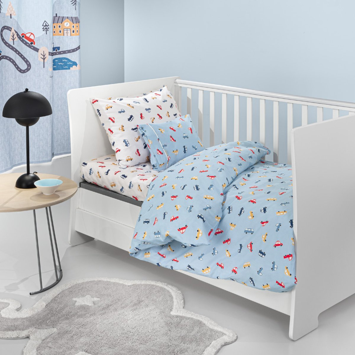 Σεντόνια κούνιας σετ σε γαλάζιο χρώμα με πολύχρωμο σχέδιο αυτοκινητάκια από την εταιρεία Guy Laroche. Είναι κατασκευασμένα από 100% βαμβάκι 144 κλωστών που τα καθιστά ιδιαιτέρα απαλά και κατάλληλα για το βρεφικό δερματάκι. Το κατωσέντονο είναι λευκό και έχει σχέδιο αυτοκινητάκια. Στο σετ περιλαμβάνεται και η μαξιλαροθήκη με φάσα με το σχέδιο του πανωσέντονου. Συνδυάστε τα με τα υπόλοιπα προϊόντα του ίδιου σχεδίου για ένα ολοκληρωμένο αποτέλεσμα στο βρεφικό δωμάτιο. **Το σχέδιο στην μαξιλαροθήκη ενδέχεται να διαφέρει από αυτό της φωτογραφίας, καθώς η εταιρεία παράγει μαξιλαροθήκες από όλο το σχέδιο του υφάσματος και τις συσκευάζει με τυχαία σειρά.**