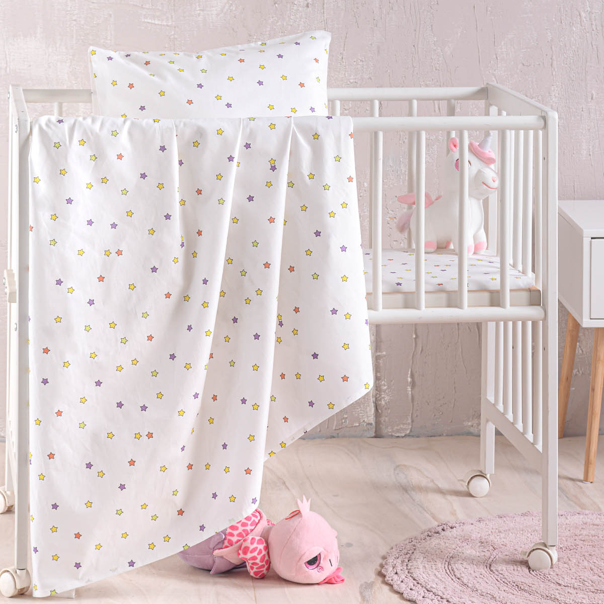 Σεντόνια για την κούνια του μωρού από την εταιρεία Rythmos σε λευκό χρώμα με πολύχρωμες λεπτομέρειες και σχέδιο αστεριών. Είναι κατασκευασμένα από 100% βαμβάκι που τα καθιστά απαλά και ανθεκτικά. Στο σετ περιλαμβάνεται η μαξιλαροθήκη φάκελος. Συνδυάστε τα με τα υπόλοιπα είδη της σειράς για ένα ολοκληρωμένο αποτέλεσμα στο βρεφικό δωμάτιο.