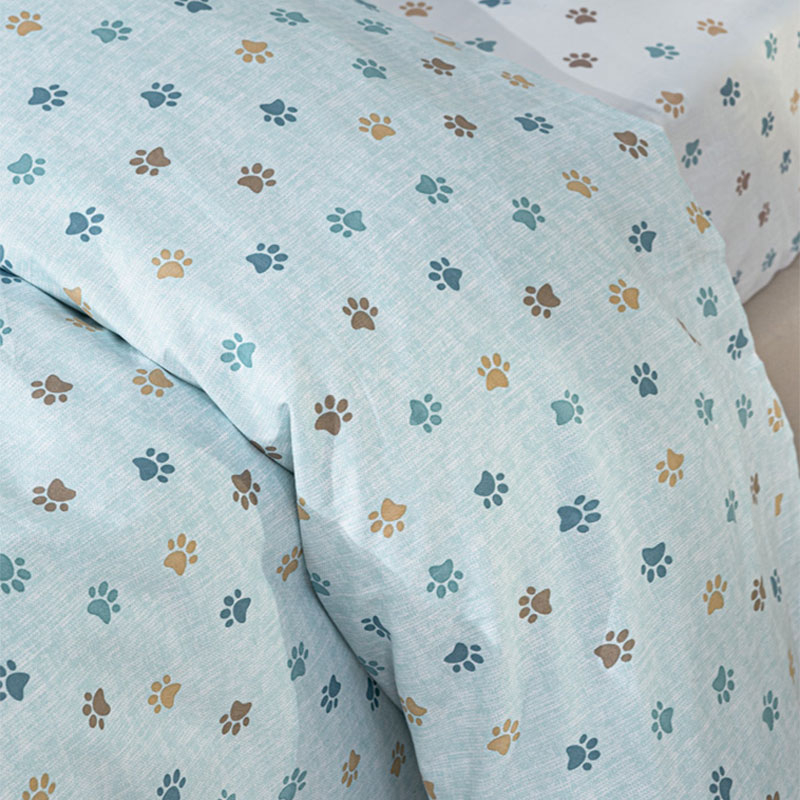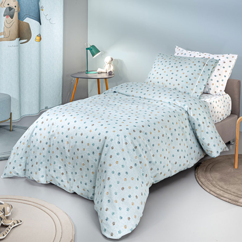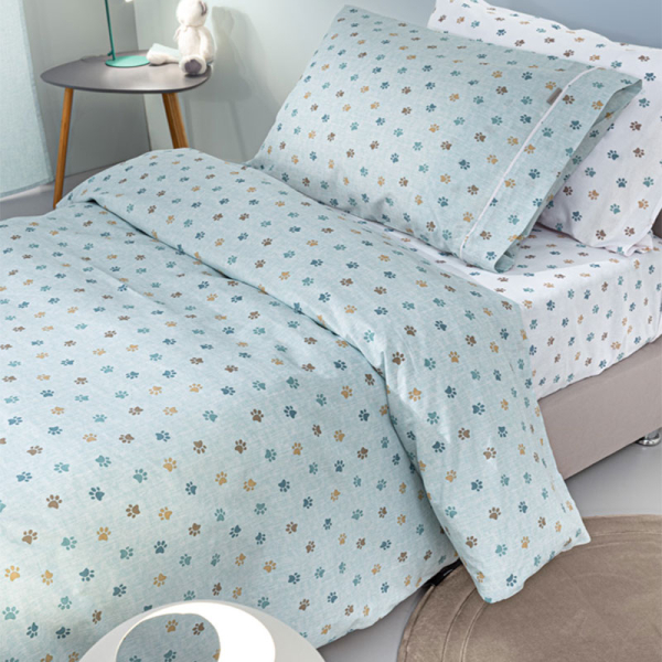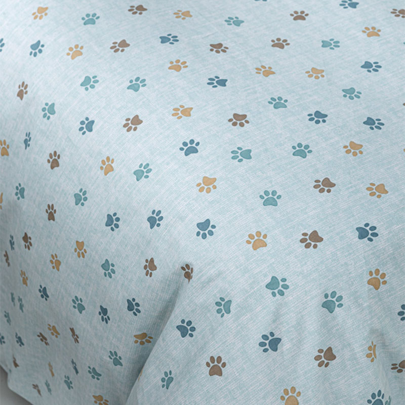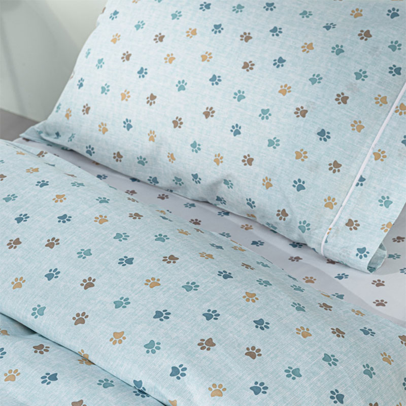 Σεντόνια μονά σετ με σχέδιο πατημασιές ζώων σε γαλάζιο χρώμα με μπεζ-πετρόλ λεπτομέρειες από την εταιρεία Guy Laroche. Είναι κατασκευασμένα από 100% βαμβάκι 144 κλωστών που τα καθιστά ιδιαιτέρα απαλά. Το κατωσέντονο έχει σχέδιο πατημασιές ζώων σε λευκό φόντο και διατίθεται με ή χωρίς λάστιχο. Στο σετ περιλαμβάνεται και η μαξιλαροθήκη με φάσα με το σχέδιο του πανωσέντονου. Συνδυάστε τα με τα υπόλοιπα προϊόντα του ίδιου σχεδίου για ένα ολοκληρωμένο αποτέλεσμα.