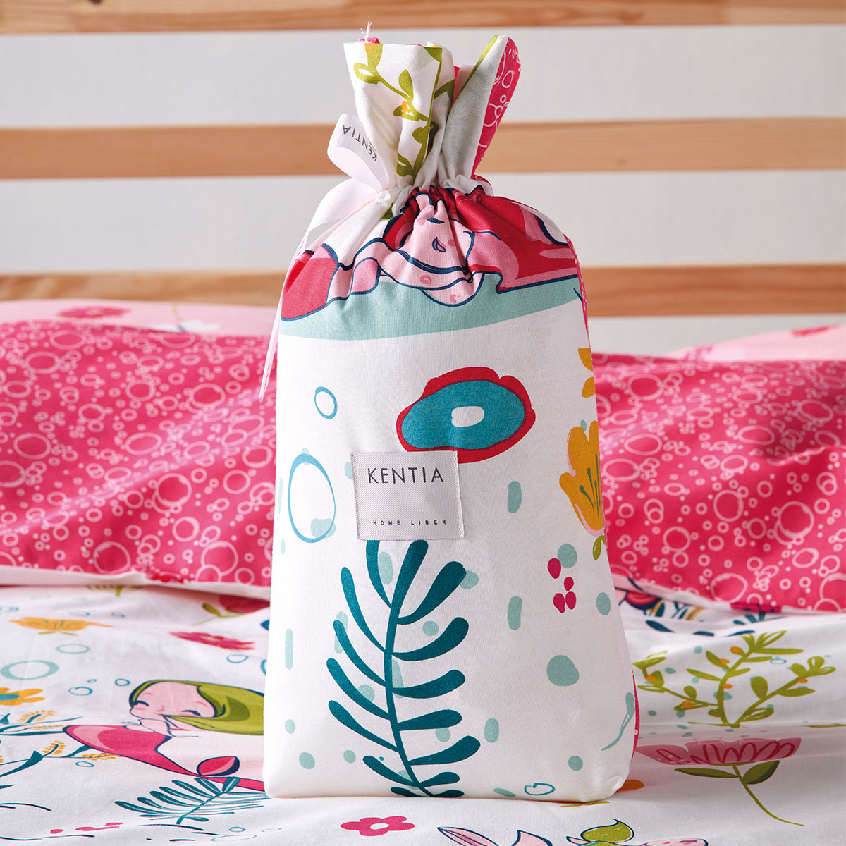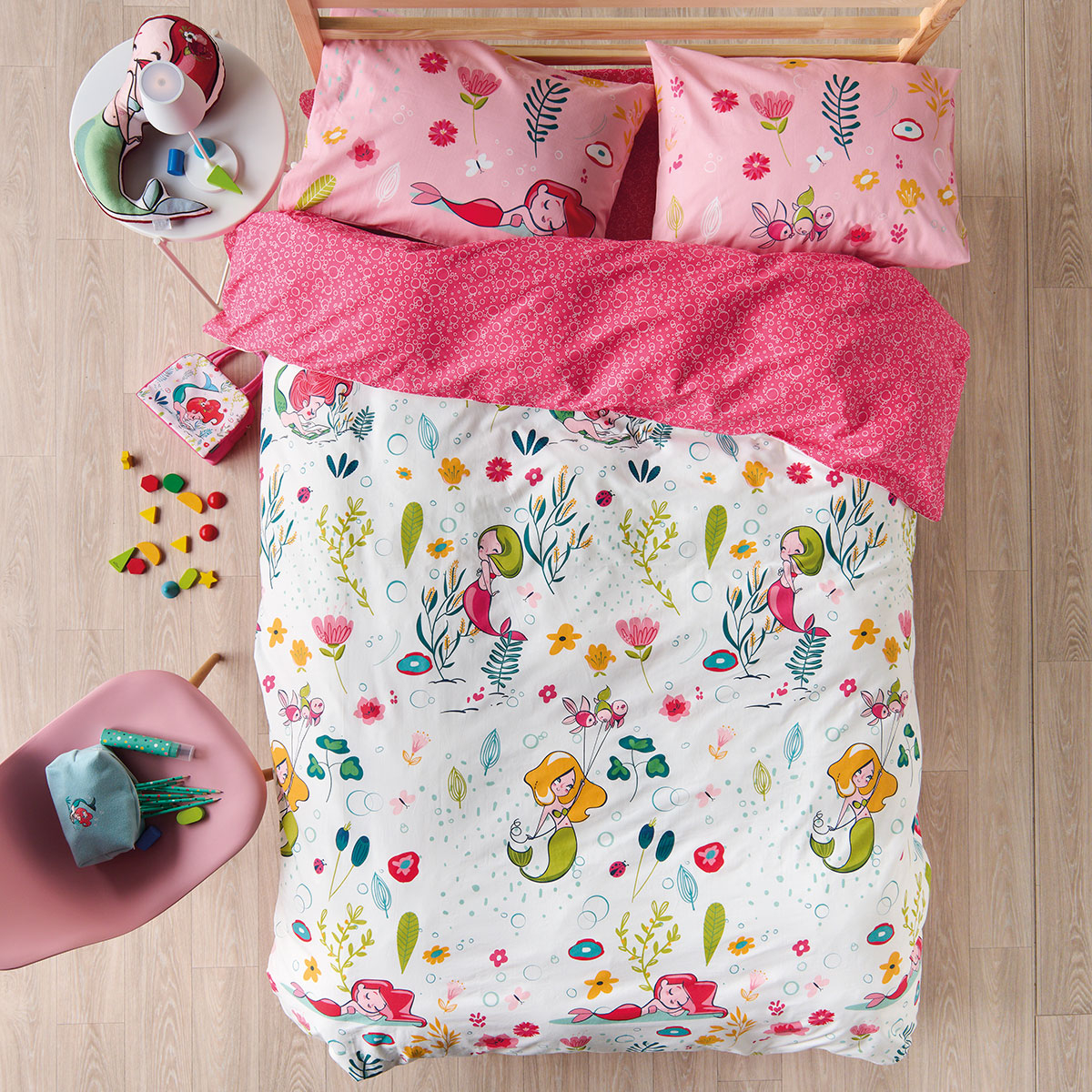Σετ μονά σεντόνια από την εταιρεία Kentia. Έχουν λευκό φόντο με σχέδιο γοργόνα σε ροζ-πολύχρωμες αποχρώσεις. Το κατωσέντονο έχει μοντέρνο σχέδιο σε ροζ χρώμα. Το ύφασμά τους είναι 100% βαμβάκι 150 κλωστών, απαλό και ανθεκτικό. Η μαξιλαροθήκη είναι φάκελος με το σχέδιο του πανωσέντονου. Συνδυάστε το με τα υπόλοιπα προϊόντα της ίδιας σειράς για ένα ολοκληρωμένο αποτέλεσμα.