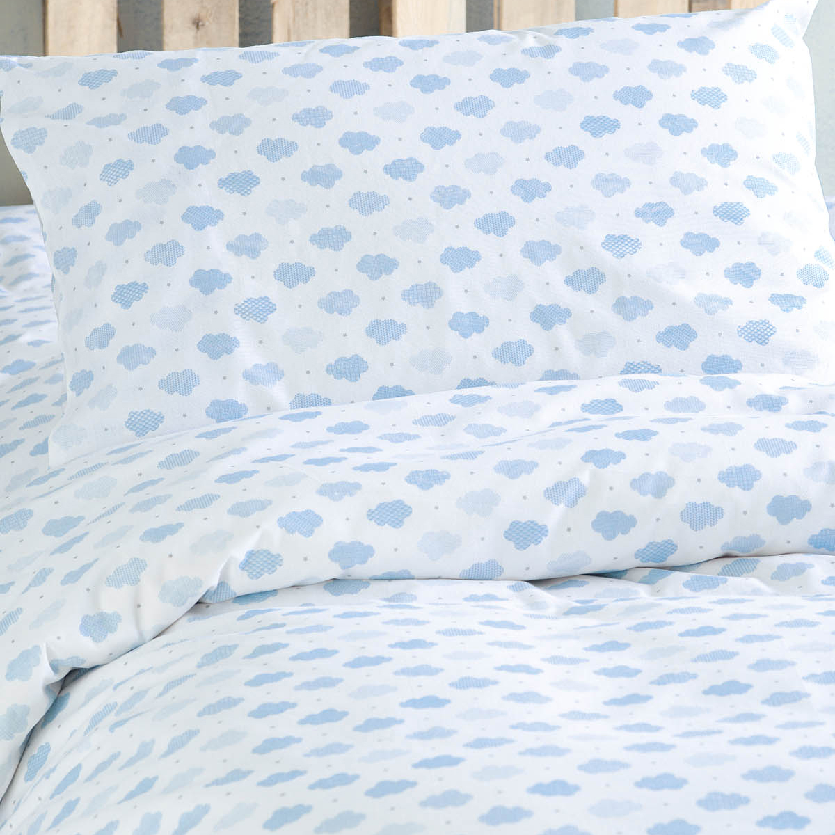 Σεντόνια για μονό κρεβάτι σε λευκό φόντο, γαλάζιες λεπτομέρειες και σχέδιο συννεφάκια από την εταιρεία Rythmos Home. Η σύνθεσή τους από 100% βαμβάκι 144 κλωστών, τα καθιστά απαλά και ανθεκτικά. Το κατωσέντονο διατίθεται με επιλογή λάστιχο ή χωρίς λάστιχο. Στο σετ περιλαμβάνεται η μαξιλαροθήκη φάκελος.