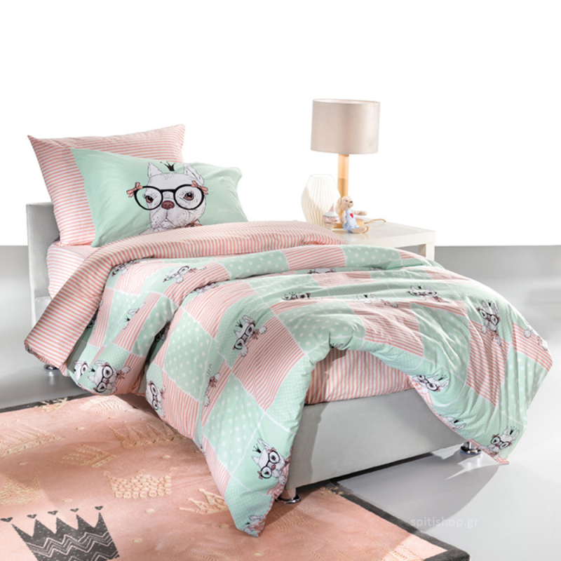 Σετ παιδικά σεντόνια σε βεραμάν χρώμα με ροζ λεπτομέρειες και τυπωτό σχέδιο σκυλάκια. Η ποιότητά τους από 100% βαμβάκι 144 κλωστών, προσφέρει απαλότητα και ανθεκτικότητα. Συνδυάστε τα με τα υπόλοιπα προϊόντα της ίδιας σειράς για ένα ολοκληρωμένο αποτέλεσμα με την εγγύηση της Saint Clair.
