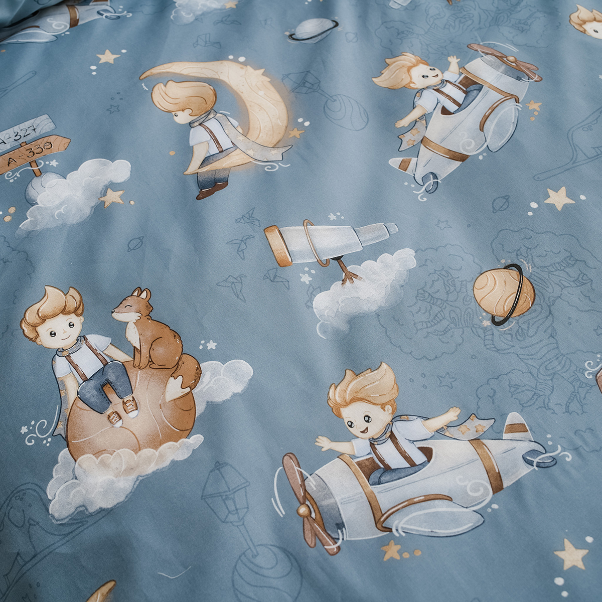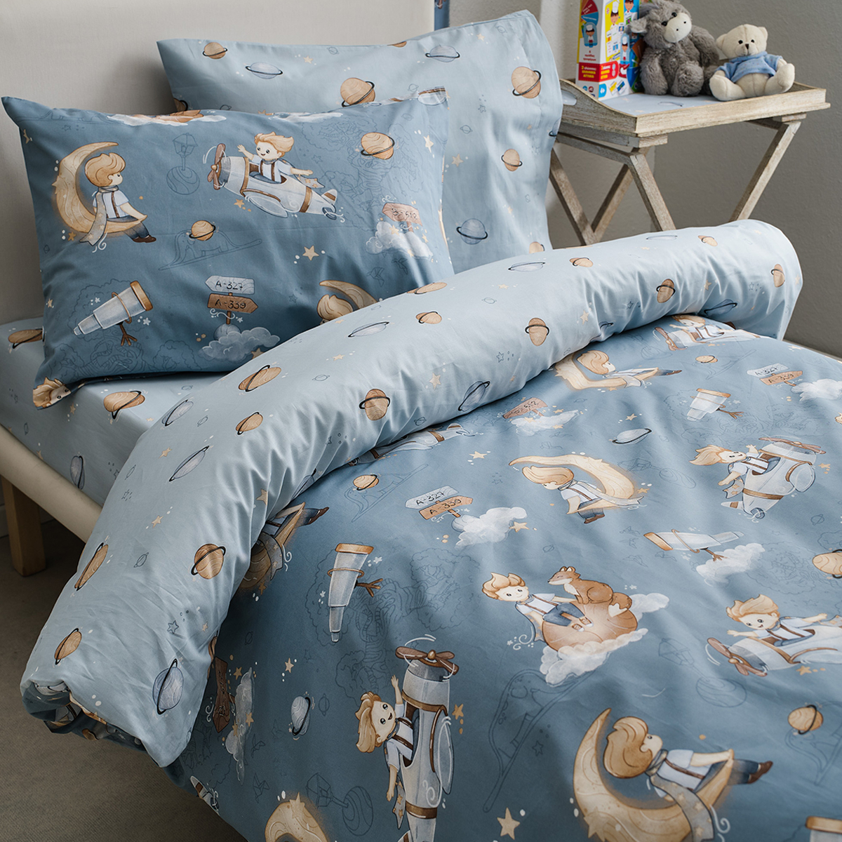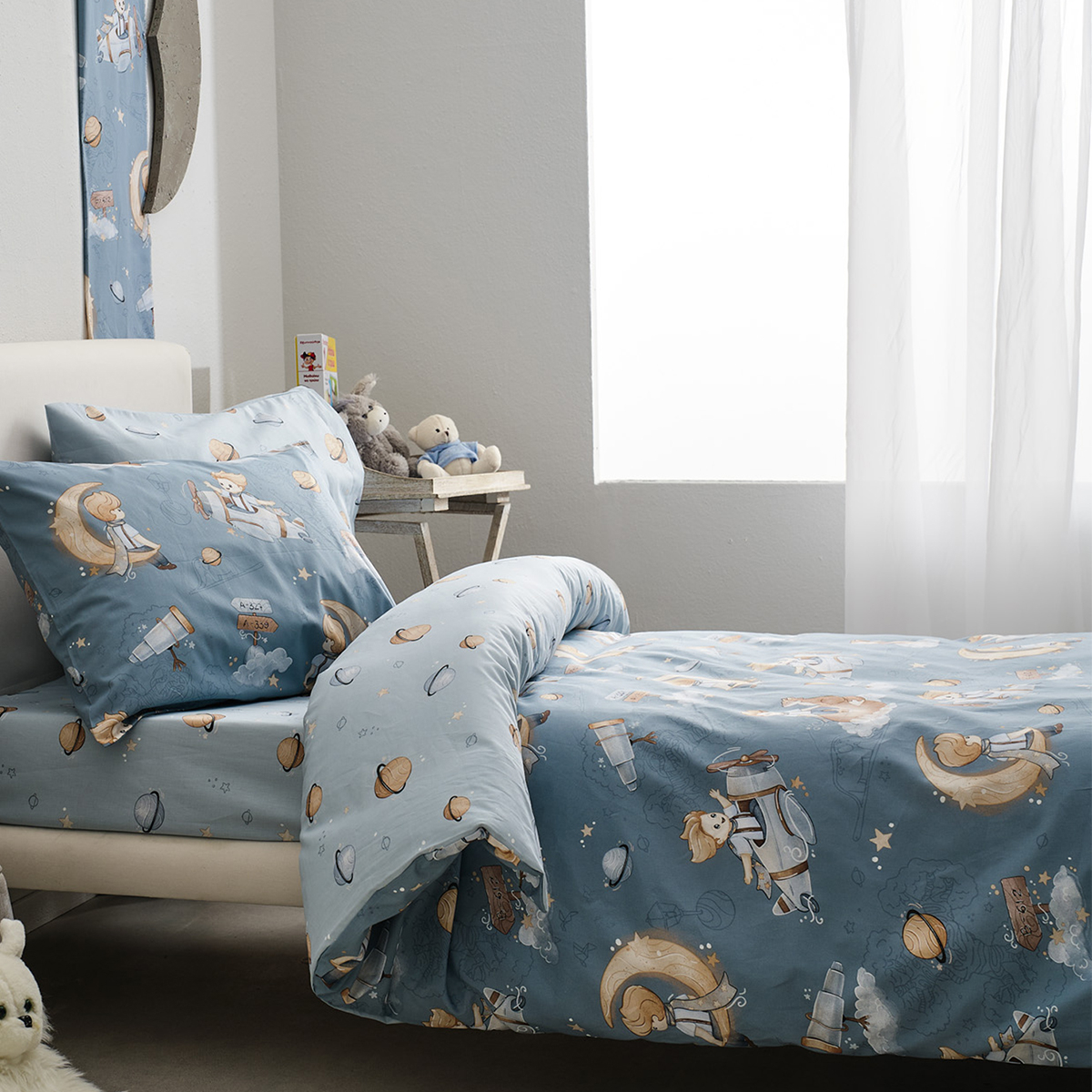 Σεντόνια μονά σετ σε γαλάζιο χρώμα, με μπεζ λεπτομέρειες και παιδικές φιγούρες σχέδιο από την εταιρία Vesta Home. Είναι κατασκευασμένα από 100% βαμβάκι 144 κλωστών, που τα καθιστά ανθεκτικά και απαλά. Υπάρχει επιλογή τύπου κατωσέντονου με ή χωρίς λάστιχο. Στο σετ περιλαμβάνεται η μαξιλαροθήκη φάκελος με το σχέδιο του πανωσέντονου. Συνδυάστε τα με τα υπόλοιπα είδη της ίδιας σειράς για ένα ολοκληρωμένο αποτέλεσμα. **Το σχέδιο στις μαξιλαροθήκες ενδέχεται να διαφέρει από αυτό της φωτογραφίας, καθώς η εταιρεία παράγει μαξιλαροθήκες από όλο το σχέδιο του υφάσματος και τις συσκευάζει με τυχαία σειρά.**