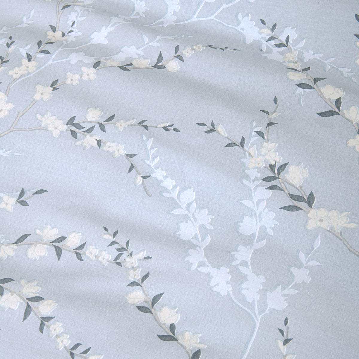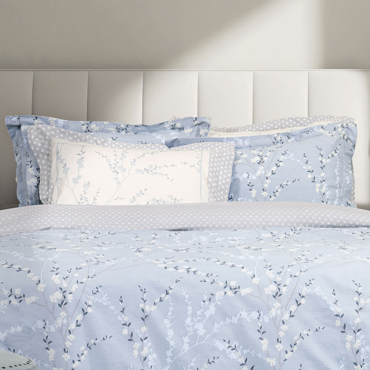 Σετ υπέρδιπλα σεντόνια σε γαλάζιο χρώμα, με λευκές λεπτομέρειες και φλοράλ σχέδιο από την εταιρεία Nima. Το ύφασμα είναι 100% βαμβάκι 144 κλωστών που τα καθιστά ανθεκτικά και απαλά. Στο σετ περιλαμβάνονται οι μαξιλαροθήκες oxford. Υπάρχει επιλογή τύπου κατωσέντονου με ή χωρίς λάστιχο. Συνδυάστε τα με τα υπόλοιπα είδη του ίδιου σχεδίου για ένα ολοκληρωμένο αποτέλεσμα.