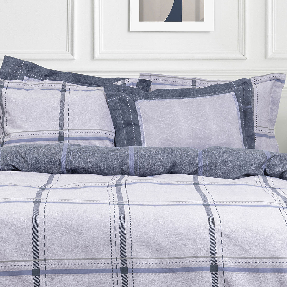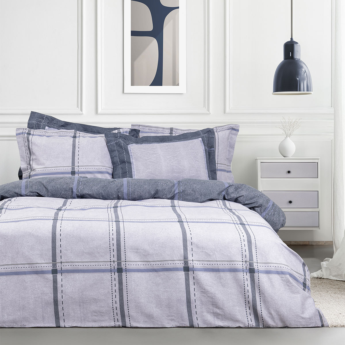Σετ υπέρδιπλα σεντόνια σε γκρι-γαλάζιο χρώμα, με μπλε λεπτομέρειες και καρό σχέδιο από την εταιρεία Nima. Το ύφασμα είναι 100% βαμβάκι 144 κλωστών που τα καθιστά ανθεκτικά και απαλά. Στο σετ περιλαμβάνονται οι μαξιλαροθήκες oxford. Υπάρχει επιλογή τύπου κατωσέντονου με ή χωρίς λάστιχο. Συνδυάστε τα με τα υπόλοιπα είδη του ίδιου σχεδίου για ένα ολοκληρωμένο αποτέλεσμα.