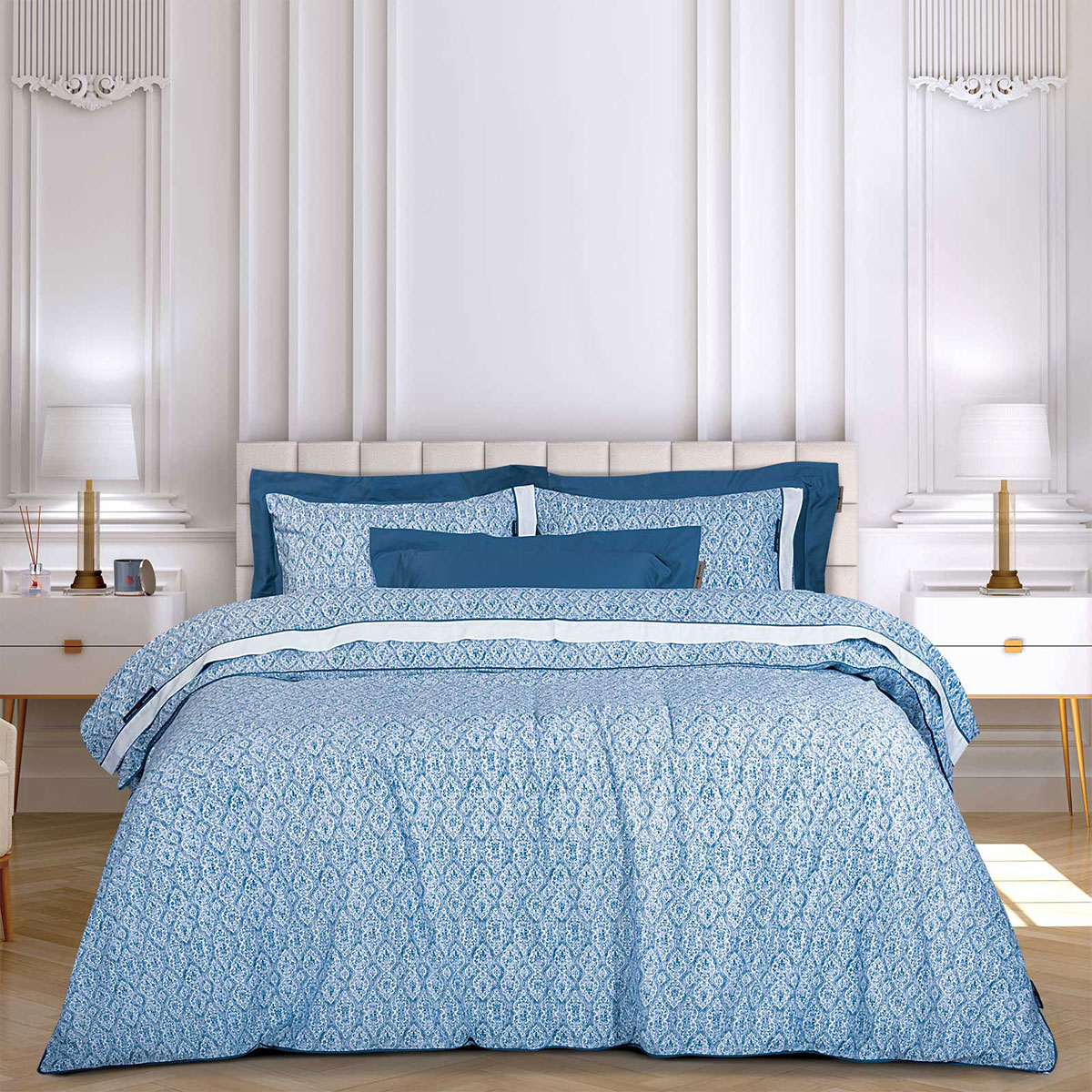 Σεντόνια υπέρδιπλα σετ σε λευκό φόντο, με μπλε λεπτομέρειες και έθνικ σχέδιο από τον οίκο Greenwich Polo. Είναι κατασκευασμένα από100% βαμβακοσατέν 210 κλωστών που τα καθιστά εξαιρετικά μαλακά, ανθεκτικά και εύκολα στο σιδέρωμα. Ιδανικό σετ για να στολίσετε την κρεβατοκάμαρά σας με ποιότητα και στυλ. Στο σετ περιλαμβάνονται οι μαξιλαροθήκες φάκελος με το σχέδιο του πανωσέντονου. Συνδυάστε τα με τα υπόλοιπα είδη του ιδίου σετ για ένα ολοκληρωμένο αποτέλεσμα.
