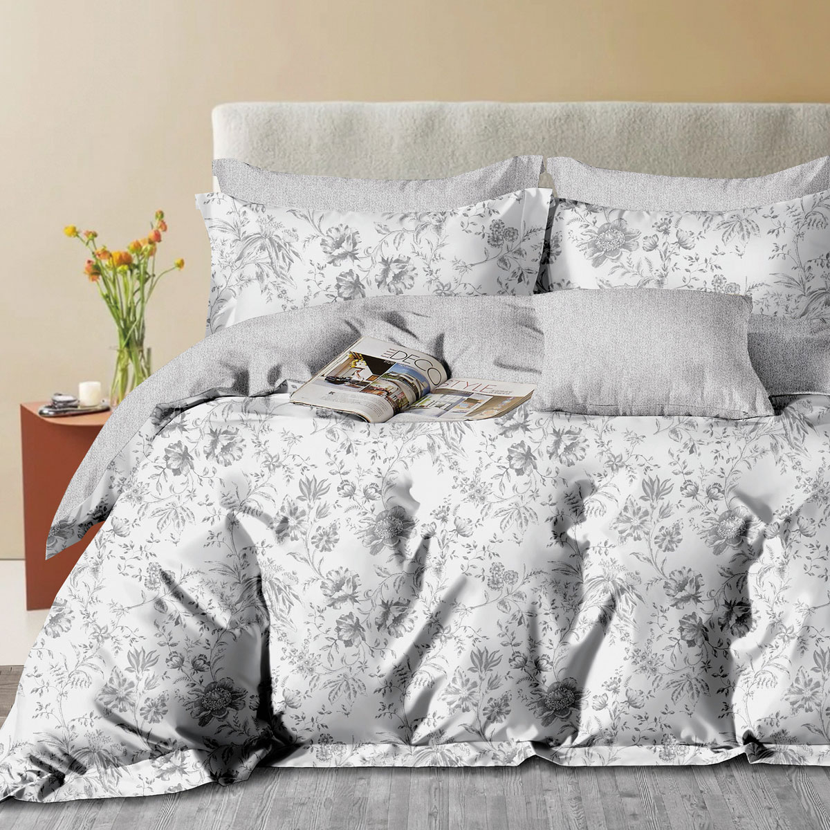 Σεντόνια υπέρδιπλα σετ από την εταιρεία Rythmos σε ανοιχτό γκρι χρώμα με φλοράλ σχέδιο. Το κατωσέντονο είναι μονόχρωμο γκρι. Είναι κατασκευασμένα από 100% βαμβακοσατέν 200 κλωστών, εξαιρετικής ποιότητας, πολύ μαλακά, ανθεκτικά και εύκολα στο σιδέρωμα. Στο σετ περιλαμβάνονται οι μαξιλαροθήκες oxford με το σχέδιο του πανωσέντονου. Συνδυάστε τα με τα υπόλοιπα προϊόντα του ίδιου σχεδίου για ένα αρμονικό αποτέλεσμα. *Το σχέδιο στις μαξιλαροθήκες ενδέχεται να διαφέρει από αυτό της φωτογραφίας καθώς η εταιρεία παράγει μαξιλαροθήκες από όλο το σχέδιο του υφάσματος και τις συσκευάζει με τυχαία σειρά*