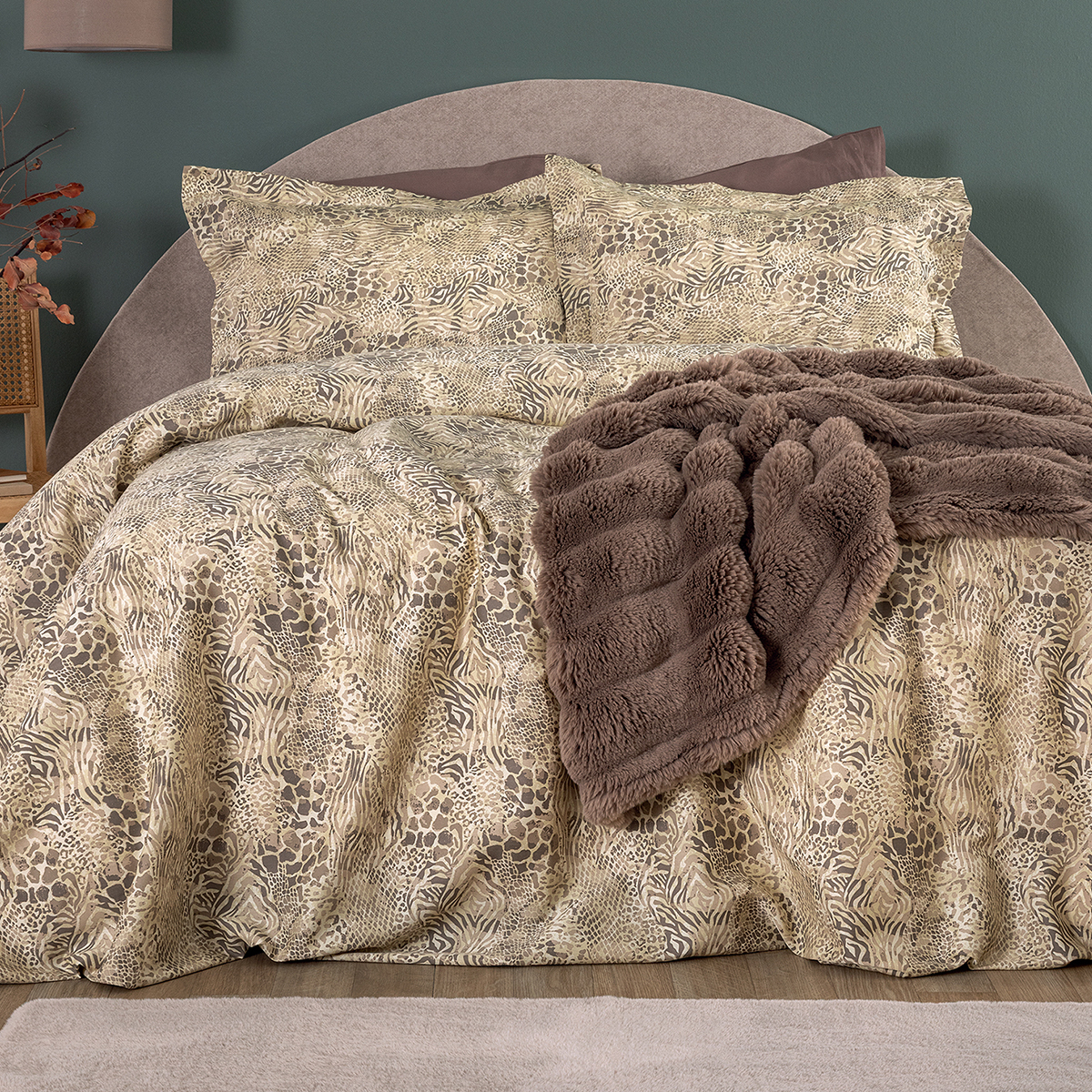 Σετ γίγας σεντόνια σε μπεζ χρώμα, με εκρού λεπτομέρειες και animal print σχέδιο από την εταιρεία Palamaiki. Είναι κατασκευασμένα από 100% βαμβακοσατέν 300 κλωστών, εξαιρετικής ποιότητας και αντοχής. Στο σετ περιλαμβάνεται η μαξιλαροθήκη με πλαίσιο περιμετρικά (oxford). Συνδυάστε τα με τα υπόλοιπα είδη της ίδιας σειράς για ένα ολοκληρωμένο αποτέλεσμα.