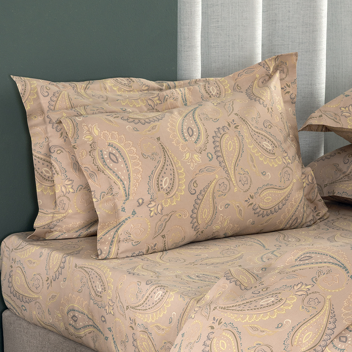 Σετ γίγας σεντόνια σε μπεζ χρώμα, με εκρού-βεραμάν λεπτομέρειες και έθνικ σχέδιο από την εταιρεία Palamaiki. Είναι κατασκευασμένα από 100% βαμβακοσατέν 300 κλωστών, εξαιρετικής ποιότητας και αντοχής. Στο σετ περιλαμβάνεται η μαξιλαροθήκη με πλαίσιο περιμετρικά (oxford). Συνδυάστε τα με τα υπόλοιπα είδη της ίδιας σειράς για ένα ολοκληρωμένο αποτέλεσμα.