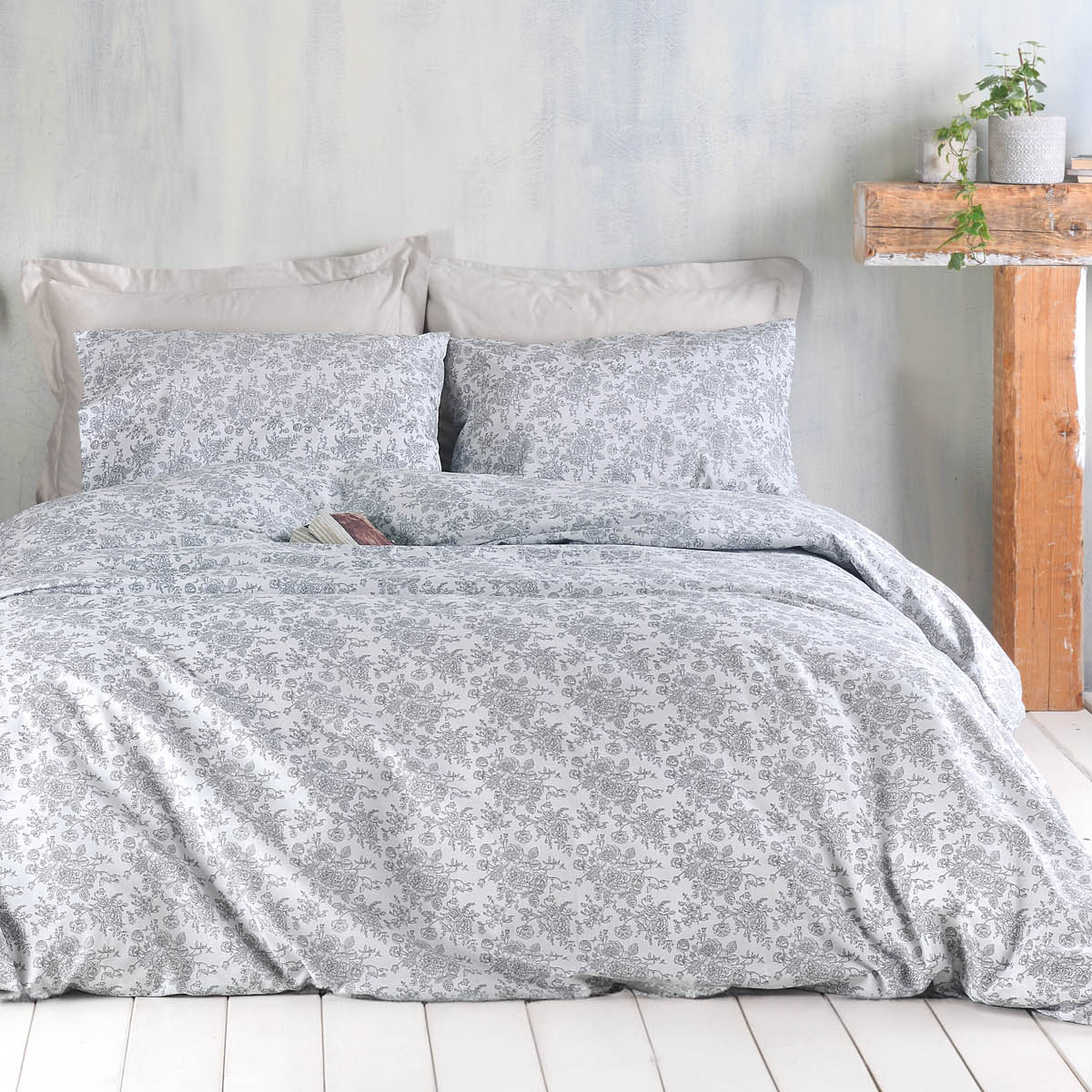Σεντόνια γίγας από την εταιρεία Rythmos με φλοράλ σχέδιο σε λευκό-γκρι χρώμα. Η ποιότητά τους από 100% βαμβάκι 144 κλωστών τα καθιστά απαλά και ανθεκτικά. Υπάρχει επιλογή τύπου κατωσέντονου με ή χωρίς λάστιχο. Στο σετ περιλαμβάνονται οι μαξιλαροθήκες φάκελος. Συνδυάστε τα με τα υπόλοιπα προϊόντα της ίδιας σειράς για ένα ολοκληρωμένο αποτέλεσμα.