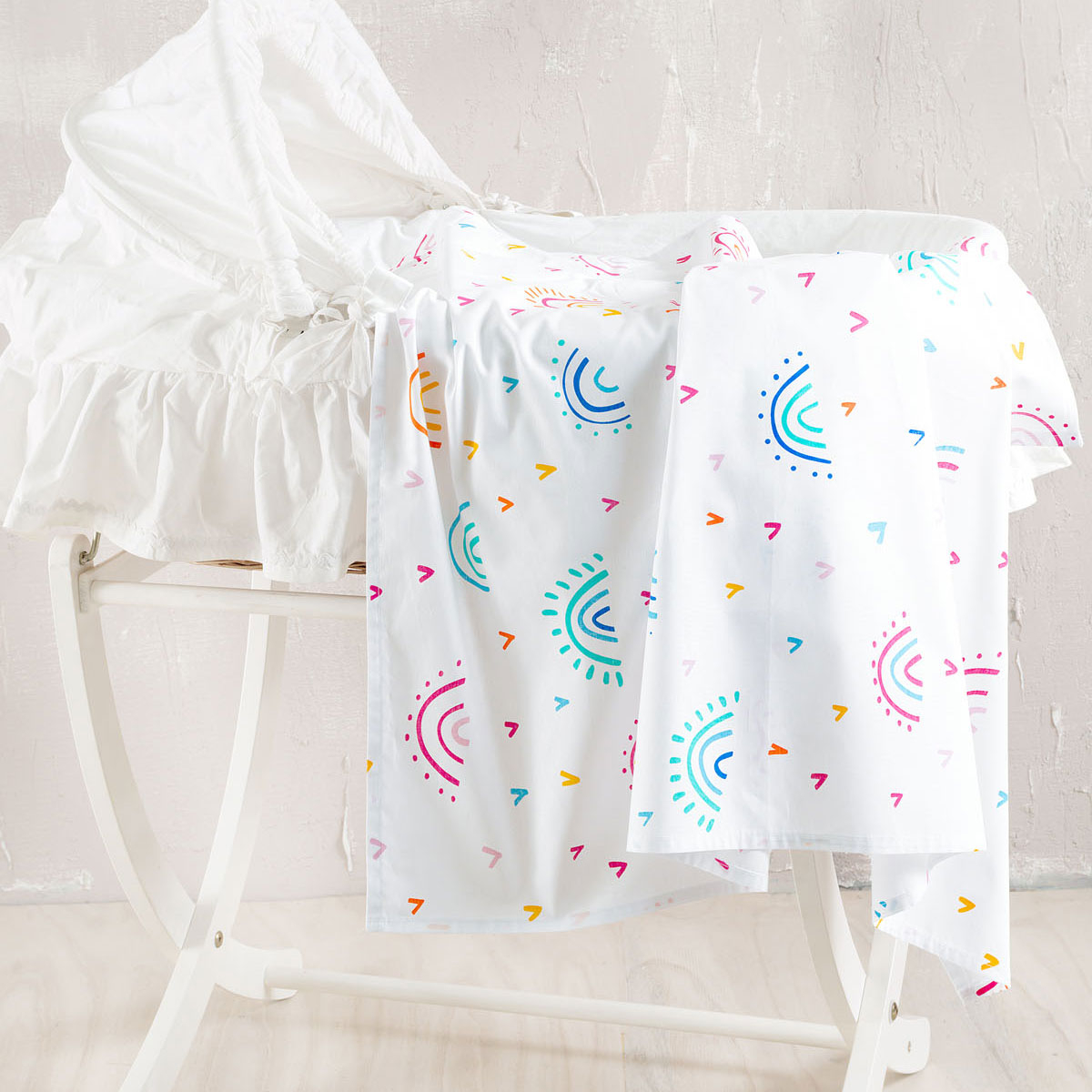 Σεντόνι για το λίκνο ή την καλαθούνα του μωρού σε λευκό χρώμα, με πολύχρωμες λεπτομέρειες και σχέδιο ουράνιο τόξο από την εταιρεία Rythmos. Είναι κατασκευασμένο από 100% βαμβάκι που το καθιστά απαλό και ανθεκτικό. Συνδυάστε το με τα υπόλοιπα είδη της σειράς για ένα ολοκληρωμένο αποτέλεσμα στο βρεφικό δωμάτιο.