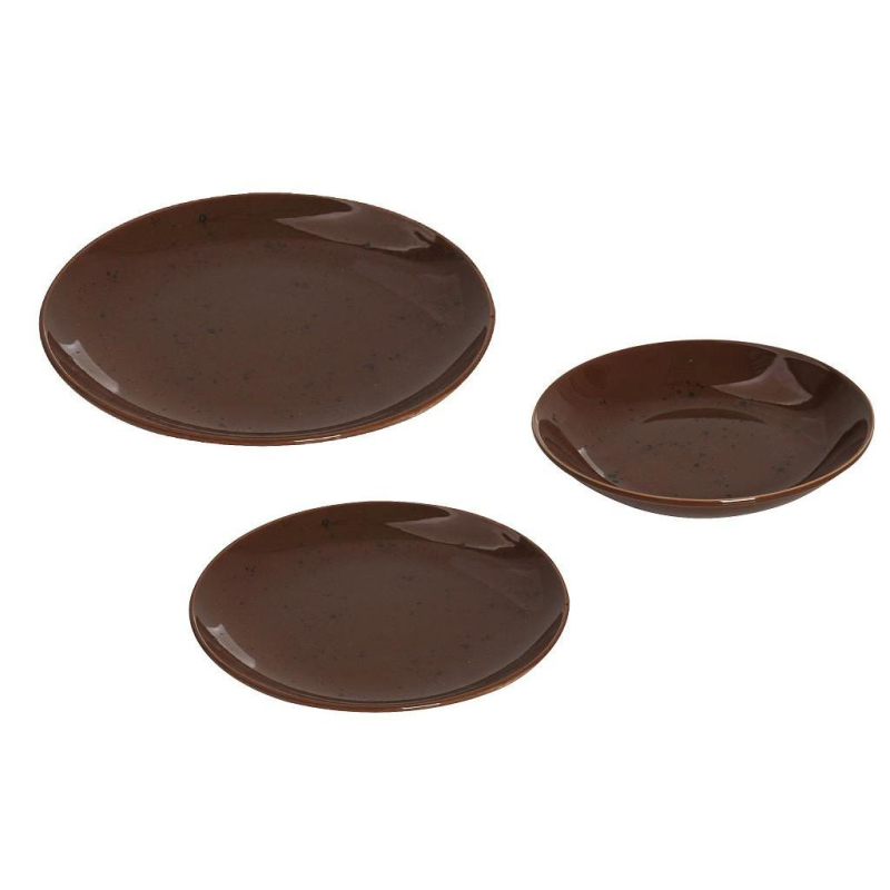 Σερβίτσιο φαγητού αποτελούμενο από ρηχά πιάτα, βαθιά πιάτα και πιάτα φρούτου. Σε καφέ χρώμα και αντικέ σχέδιο. Κατασκευασμένο από κεραμικό υλικό.