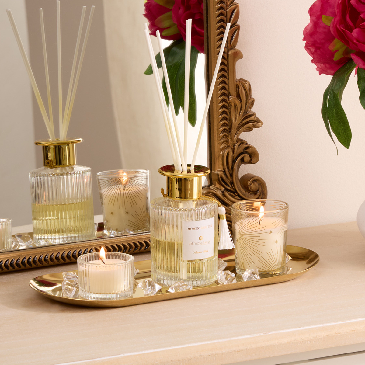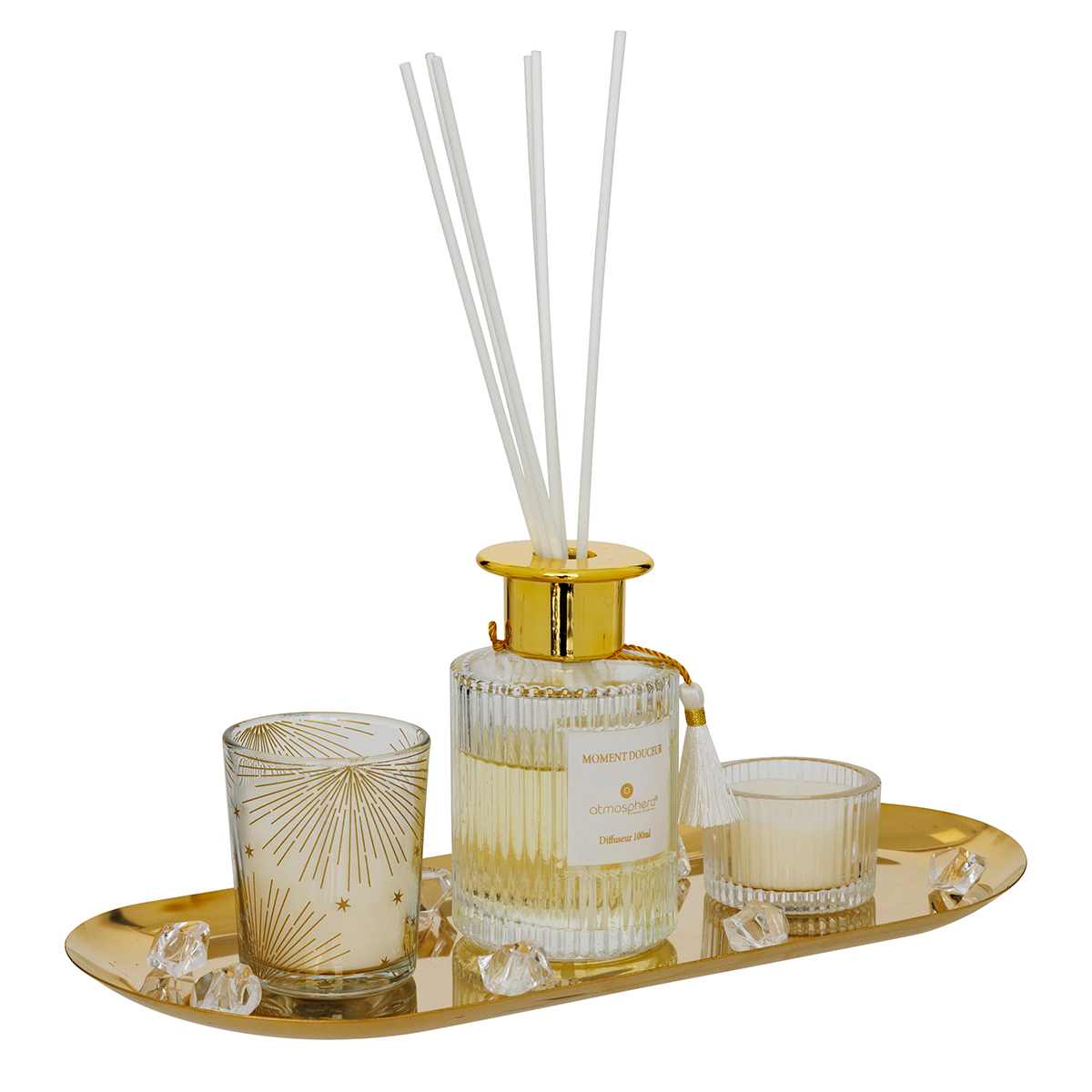 Σετ αρωματικών σε δισκάκι που θα χαρίσουν μοναδικό άρωμα στο χώρο σας. Το σετ αποτελείται από: 1 αρωματικό υγρό 100ml με 6 στικς, 1 αρωματικό κερί, 1 δίσκο, 1 κηροπήγιο για ρεσώ. Το δισκάκι είναι μεταλλικό σε χρυσό χρώμα. Το υγρό και τα στικς διαχέουν άρωμα στο χώρο περίπου έως 4 εβδομάδες.