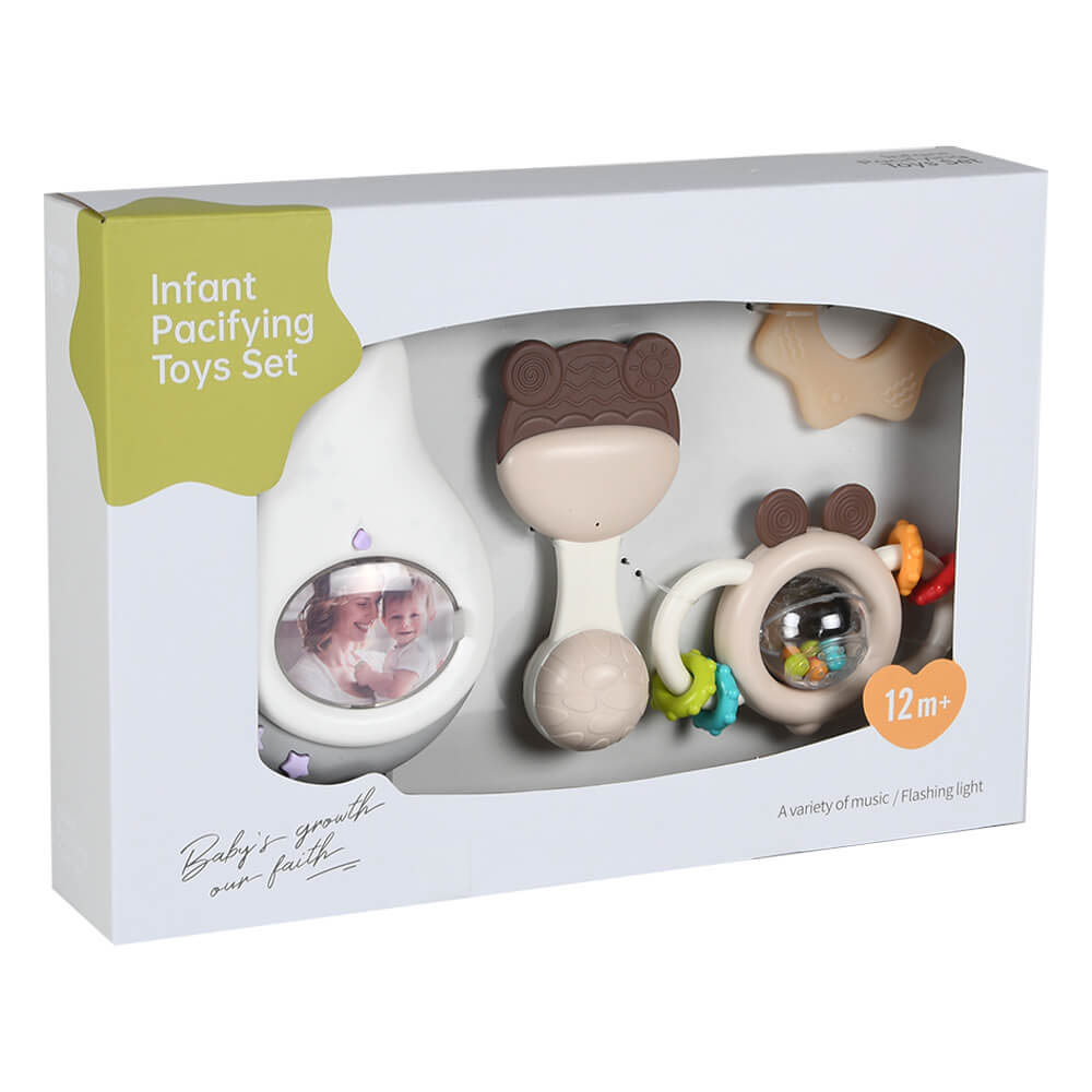 Βρεφικό σετ δώρου της εταιρείας Bebe Stars σε μπεζ αποχρώσεις. Το σετ περιλαμβάνει 2 κουδουνίστρες, 1 επιτραπέζιο φωτάκι νυκτός και 1 μασητικό. Όλα τα προϊόντα είναι κατασκευασμένα σύμφωνα με τις Ευρωπαϊκές προδιαγραφές ΕΝ71, CE από ασφαλή, μη τοξικά υλικά. Οι κουδουνίστρες παράγουν απαλούς ήχους με κάθε κίνηση και κρατούν απασχολημένο το μωρό. Το επιτραπέζιο φωτάκι νυκτός με μουσική συμβάλει στη χαλάρωση του μωρού σας, ώστε να κοιμηθεί εύκολα και γρήγορα. Η μουσική, οι χαρούμενοι ήχοι και το φως κρατούν απασχολημένο το μωρό ενώ το διασκεδάζουν και βοηθά στην ανάπτυξη των οπτικών και ακουστικών του ικανοτήτων. Διαθέτει χώρο για να τοποθετήσετε φωτογραφία. Λειτουργεί με 3 μπαταρίες ΑΑΑ και έχει διακόπτη On/off.