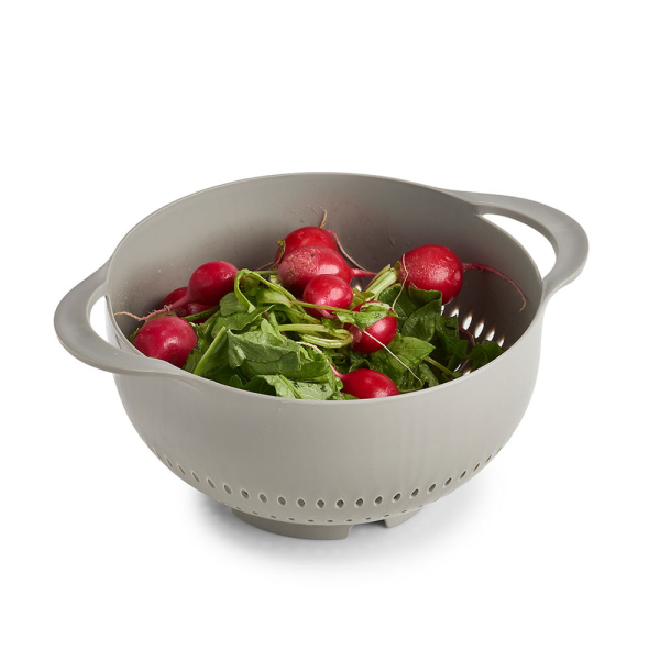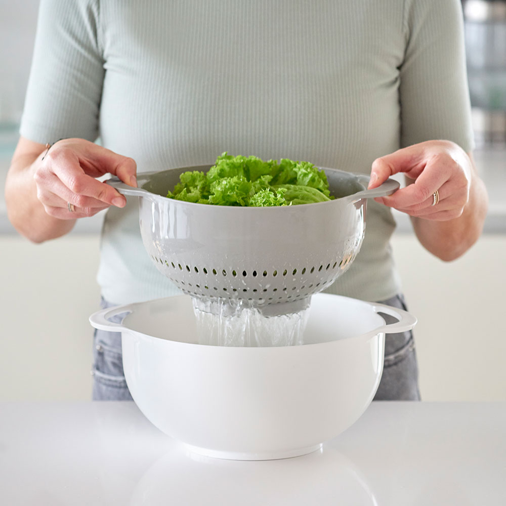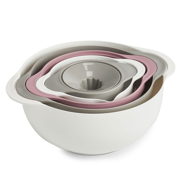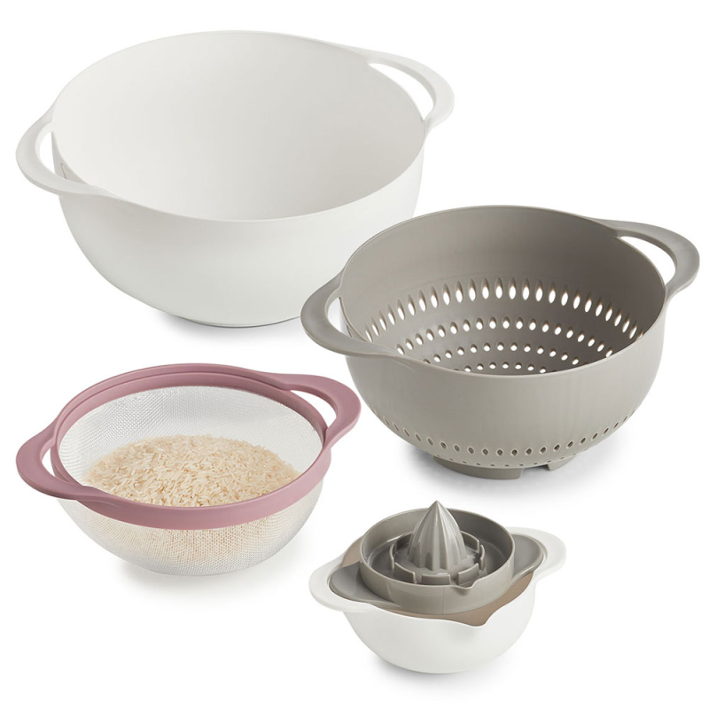 Εργαλεία κουζίνας σε σετ 5 τεμαχίων, κατασκευασμένα από ανθεκτικό πλαστικό υλικό σε λευκό, γκρι και σάπιο μήλο χρώμα. Το σετ περιλαμβάνει: 1 Μπωλ, 1 Σουρωτήρι, 1 Σουρωτήρι Με Σίτα, 1 Λεμονοστίφτη, 1 Μπωλάκι. Ο λεμονοστύφτης έχει δοχείο συλλογής με στραγγιστήρι και εσωτερική μέτρησης 100-500ml. Είναι στοιβαζόμενα για εύκολη αποθήκευση και εξοικονόμηση χώρου. Διαθέτουν λαστιχένια επίστρωση στη βάση για καλύτερο κράτημα. Ιδανικό σετ με εργαλεία που είναι απαραίτητα σε κάθε σπίτι.