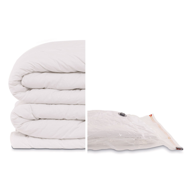 Θήκες φύλαξης σετ 2 τεμαχίων που λειτουργούν με το πρακτικό σύστημα αποθήκευσης κενού αέρα εξοικονομώντας χώρο. Είναι ιδανικές για εποχιακά ρούχα ή παπλώματα. Πολύ εύκολο στην χρήση: Τοποθετείτε τα αντικείμενα μέσα στην σακούλα, την κλείνετε και απλώς τραβάτε τον αέρα μέσω της βαλβίδας χρησιμοποιώντας την ηλεκτρική σκούπα. Ταιριάζει σε όλες τις ηλεκτρικές σκούπες. Η σκόνη, η υγρασία και οι σκώροι διατηρούνται μακριά από το περιεχόμενο. Προσοχή: Δεν συστήνεται για είδη κατασκευασμένα από μετάξι και δέρμα, καθώς και είδη που περιέχουν πούπουλα ή φτερά.