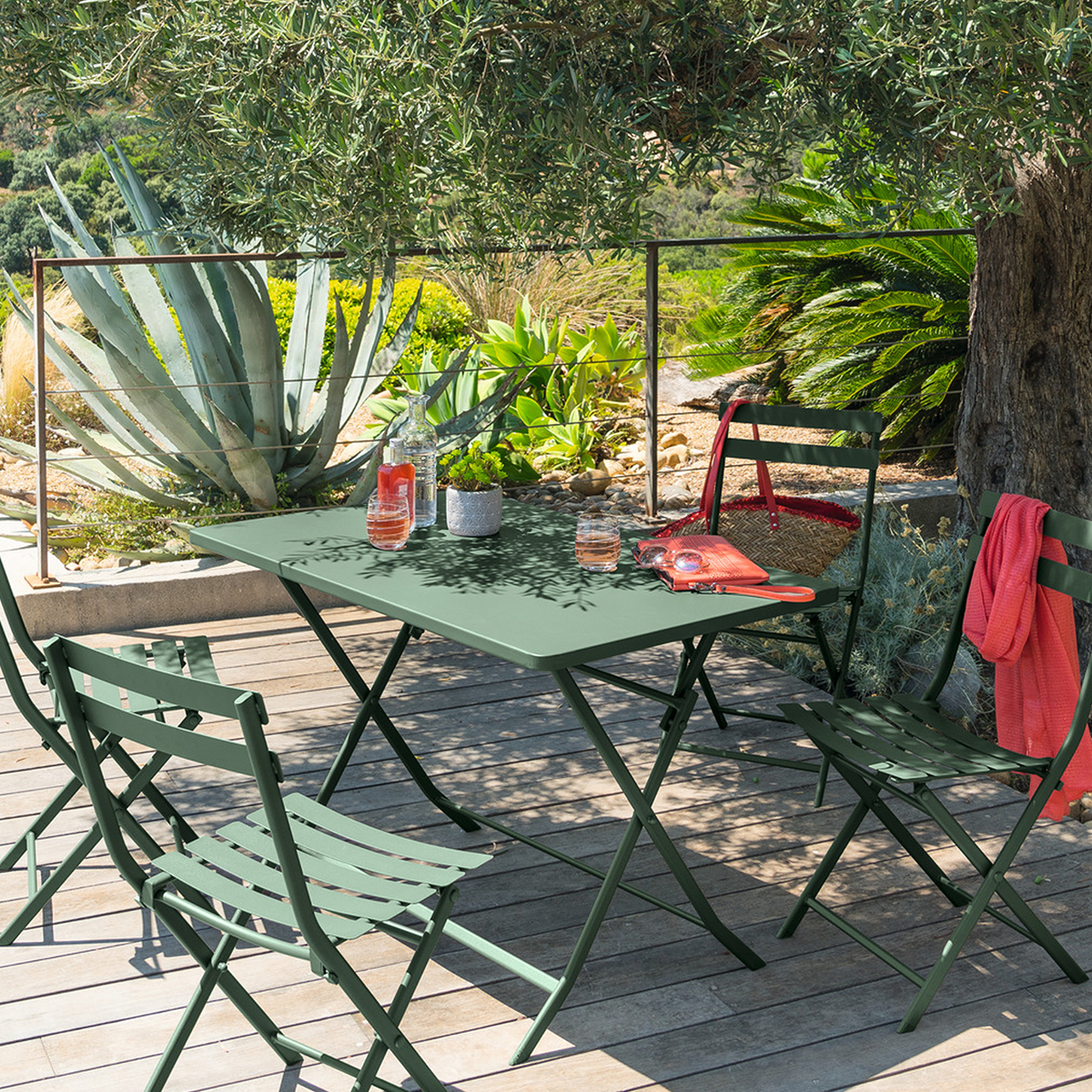 Τραπέζι εξωτερικού χώρου με καρέκλες σε χακί απόχρωση. Κατασκευασμένα από υψηλής ποιότητας υλικά, με ειδική επίστρωση που προστατεύει από την οξείδωση, την διάβρωση και την σκουριά. Το χρώμα τους δεν αλλοιώνεται από την επαφή με τον ήλιο και αυτό τα καθιστά ιδανικά για το μπαλκόνι, τον κήπο ή την βεράντα. Είναι αναδιπλούμενα για να εξοικονομείτε χώρο και να τα μεταφέρετε εύκολα.