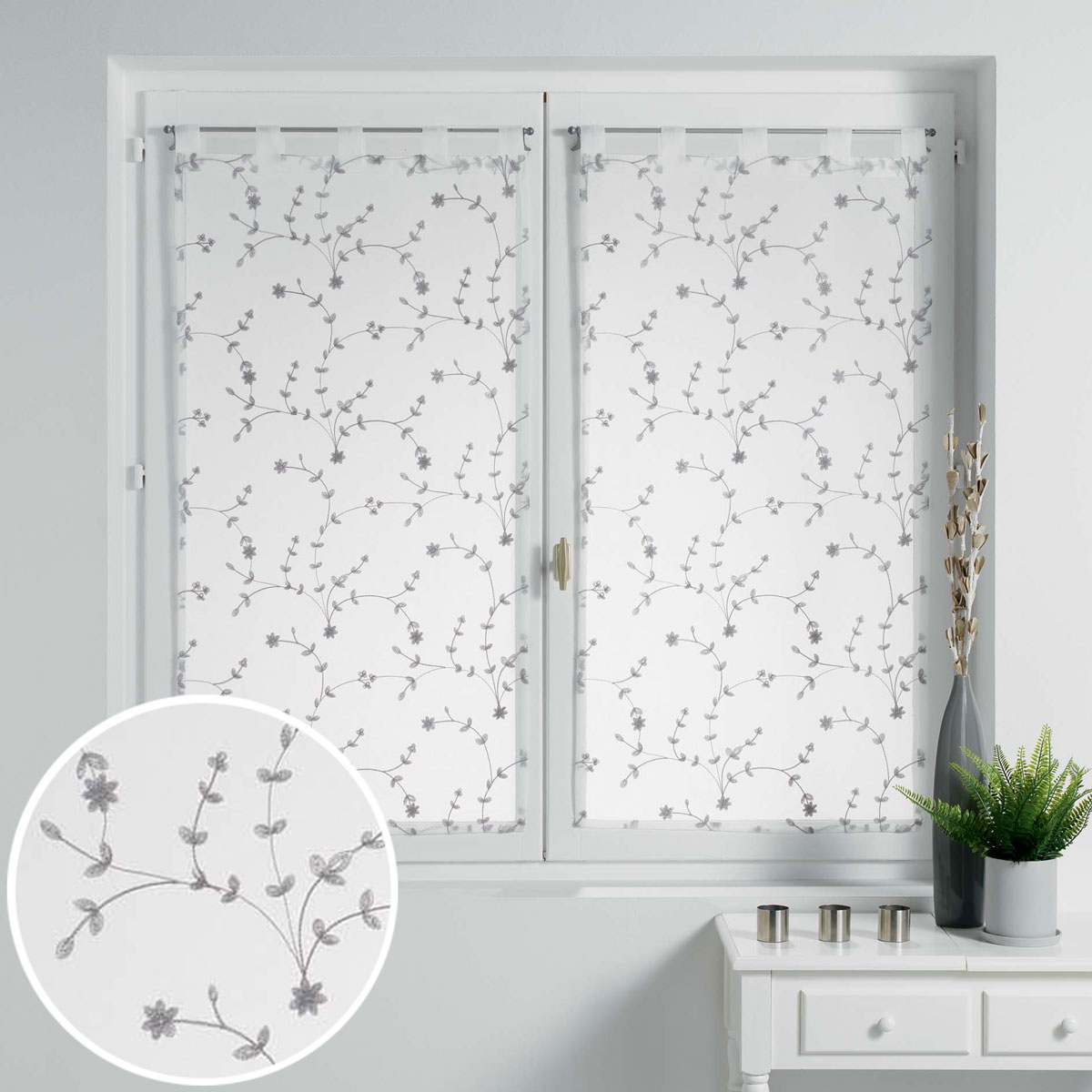Σετ δύο κουρτίνες χαμήλης σκίασης με κεντητά γκρι λουλούδια, ιδανικές για τοποθέτηση σε παράθυρο κουζίνας, το χολ, κλπ. Το ύφασμά τους είναι λευκό βουάλ από 100% polyester, που επιτρέπει στο φως να περνάει. Στο επάνω μέρος διαθέτουν τιράντες κρεμάσματος με διαμέτρο 3cm.