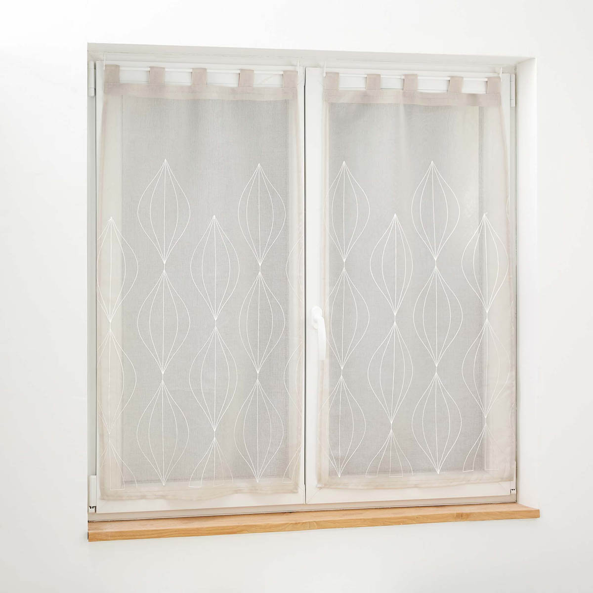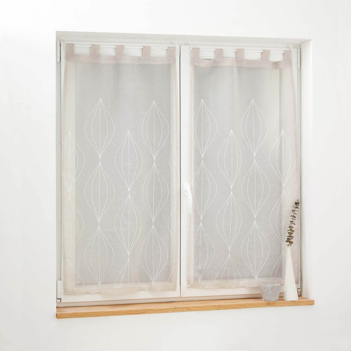 Σετ δύο κουρτίνες 60Πx120Υ χαμηλής σκίασης ιδανικές για τοποθέτηση σε παράθυρο κουζίνας, το χολ, κλπ. Το ύφασμα είναι βουάλ 100% polyester σε μπεζ χρώμα και μοντέρνο σχέδιο. Στο επάνω μέρος διαθέτουν τιράντες κρεμάσματος για εύκολη τοποθέτηση. Συνδυάστε το χρώμα και το ύφος των κουρτινών με τον χώρο σας και ανανεώστε την διακόσμησή του.