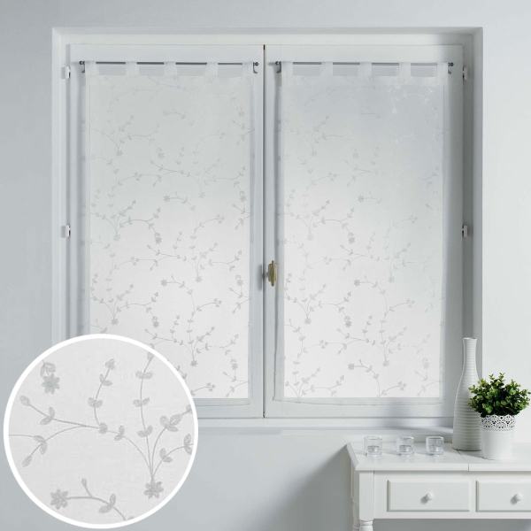 Σετ δύο κουρτίνες χαμήλης σκίασης με κεντητά λουλούδια, ιδανικές για τοποθέτηση σε παράθυρο κουζίνας, το χολ, κλπ. Το ύφασμά τους είναι λευκό βουάλ από 100% polyester, που επιτρέπει στο φως να περνάει. Στο επάνω μέρος διαθέτουν τιράντες κρεμάσματος με διαμέτρο 3cm.