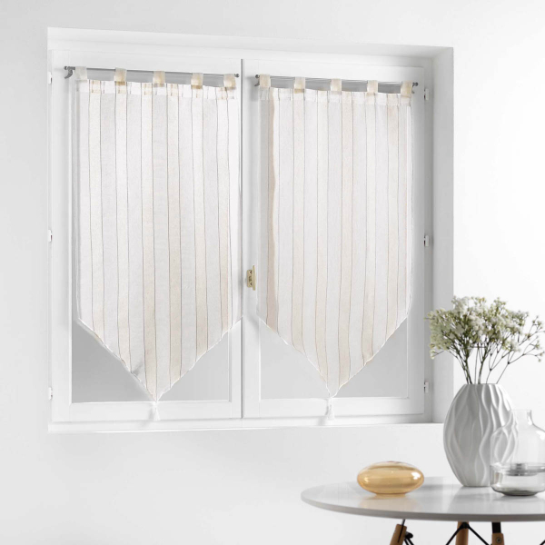 Σετ δύο κουρτίνες 60Πx90Υ χαμηλής σκίασης ιδανικές για τοποθέτηση σε παράθυρο κουζίνας, το χολ, κλπ. Το ύφασμα είναι 100% polyester σε εκρού απόχρωση με φουντίτσα στο τελείωμα. Στο επάνω μέρος διαθέτουν τιράντες κρεμάσματος με διάμετρο 3cm. Συνδυάστε το χρώμα και το ύφος των κουρτινών με τον χώρο σας και ανανεώστε την διακόσμησή του.