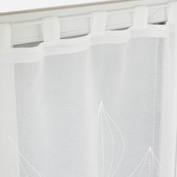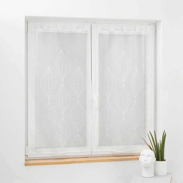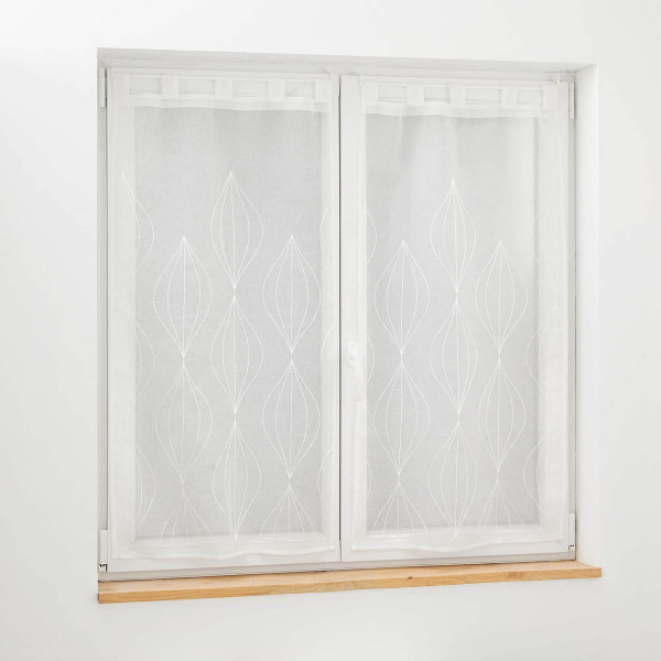 Σετ δύο κουρτίνες 60Πx90Υ χαμηλής σκίασης ιδανικές για τοποθέτηση σε παράθυρο κουζίνας, το χολ, κλπ. Το ύφασμα είναι βουάλ 100% polyester σε λευκό χρώμα και μοντέρνο σχέδιο. Στο επάνω μέρος διαθέτουν τιράντες κρεμάσματος για εύκολη τοποθέτηση. Συνδυάστε το χρώμα και το ύφος των κουρτινών με τον χώρο σας και ανανεώστε την διακόσμησή του.