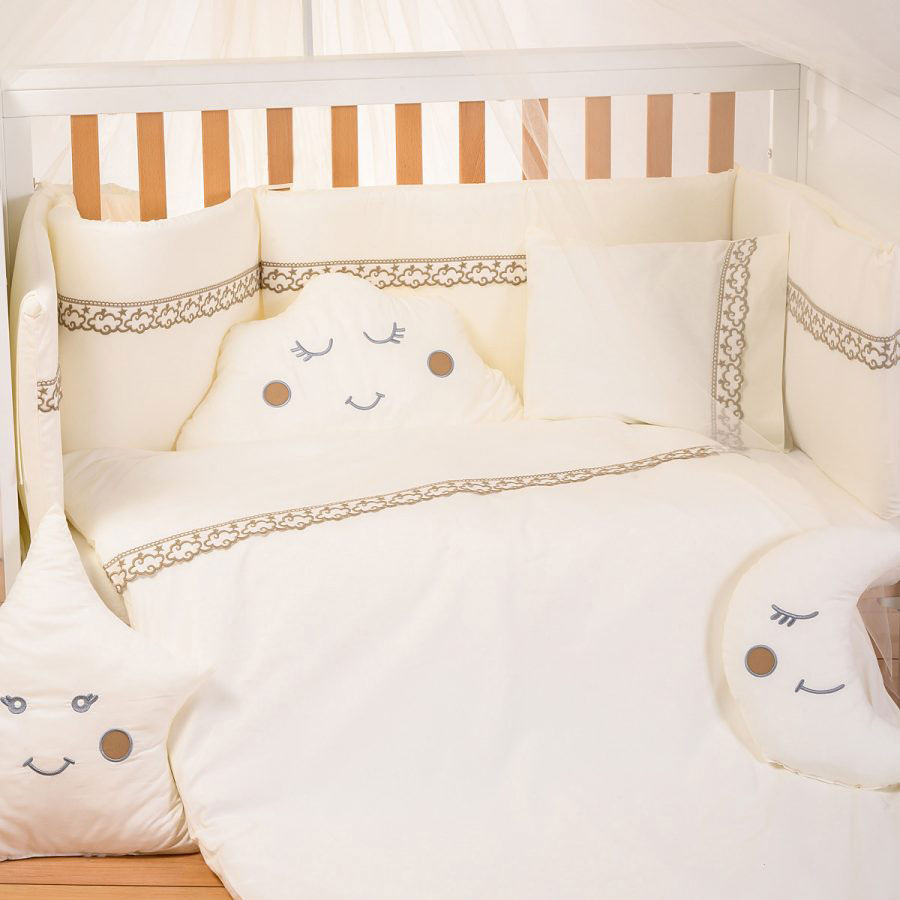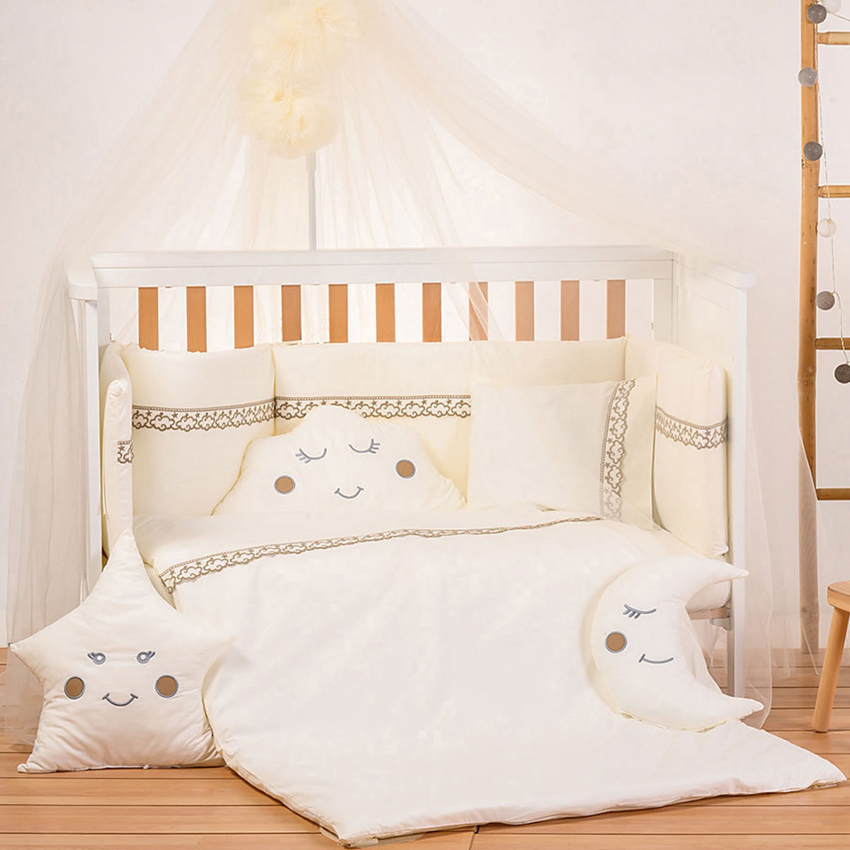 Σετ προίκας για την κούνια σε εκρού χρώμα, με μπεζ λεπτομέρειες και μοντέρνο σχέδιο από την εταιρεία Abo. Η σύνθεσή τους είναι 100% βαμβάκι που τα καθιστά μαλακά και ανθεκτικά. Με πιστοποίηση υφάσματος Oeko-Tex. Στο σετ περιλαμβάνονται κατωσέντονο με λάστιχο,1 παπλωματοθήκη, 1 πάπλωμα, 1 μαξιλαροθήκη φάκελο, 3 διακοσμητικά μαξιλάρια, 1 πάντα, 1 κουνουπιέρα και την βάση κουνουπιέρας. Ιδανικό σετ για το νεογέννητο σας. Επίσης αποτελεί μοναδική πρόταση δώρου για νεογέννητα μωράκια.