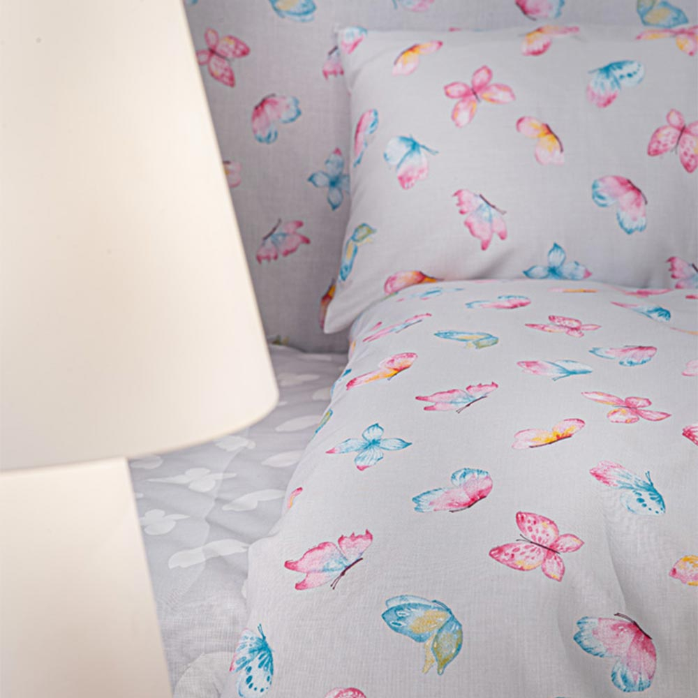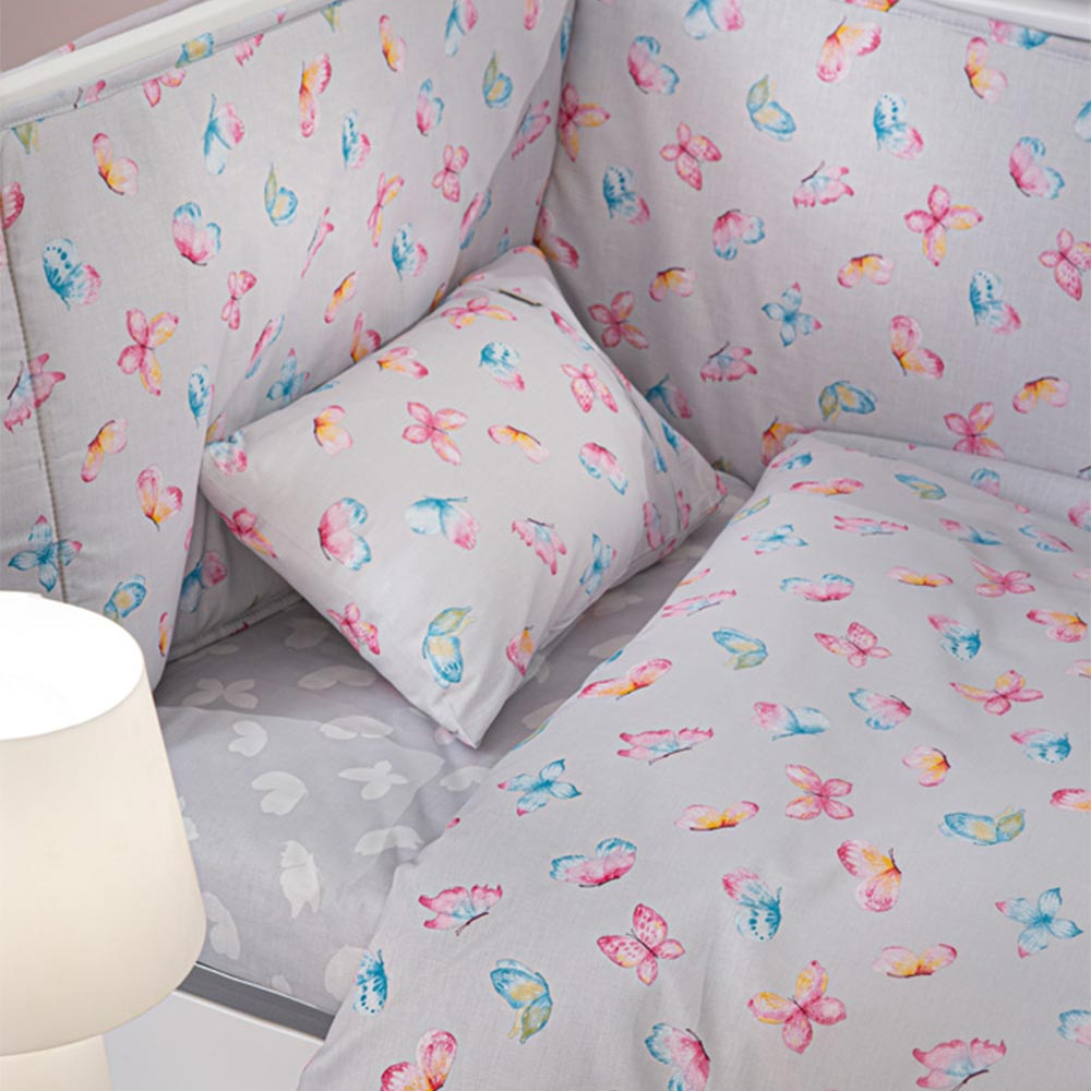 Βρεφικό σετ κούνιας σε γκρι απόχρωση, πολύχρωμες λεπτομέρειες και σχέδιο πεταλούδες από την εταιρεία Guy Laroche. Το σετ περιλαμβάνει μία πάντα κούνιας, μία μαξιλαροθήκη και μία παπλωματοθήκη κατασκευασμένα από 100% βαμβάκι 144 κλωστών. Η παπλωματοθήκη είναι διπλής όψης καθώς από την μία πλευρά έχει το σχέδιο του πανωσέντονου και από την άλλη του κατωσέντονου. Αποτελεί ιδανικό δώρο για το νεογέννητο μωράκι.