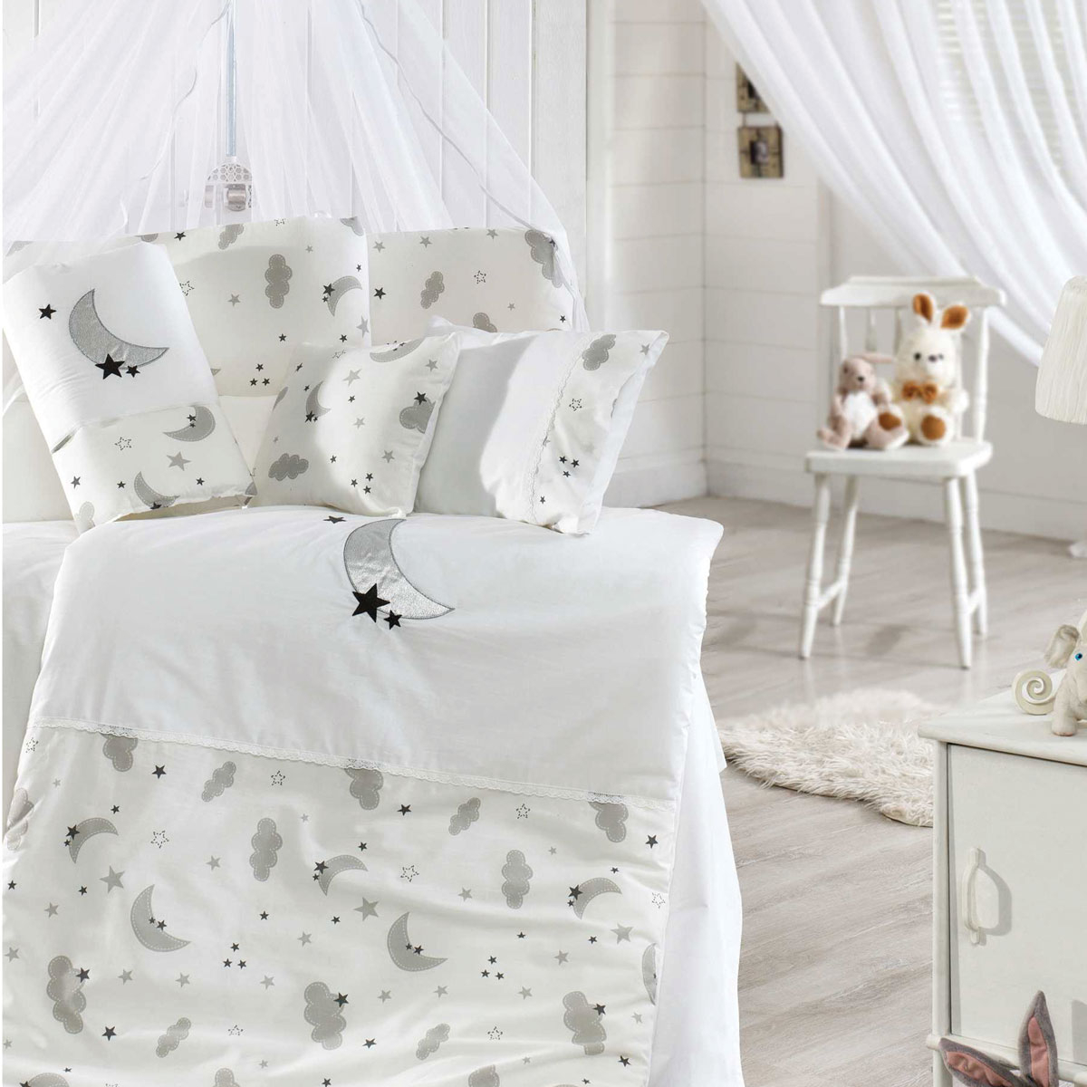 Σετ προίκας για την κούνια σε λευκό χρώμα, με γκρι λεπτομέρειες και μοντέρνο σχέδιο από την εταιρεία Abo. Η σύνθεσή τους είναι 100% βαμβάκι που τα καθιστά μαλακά και ανθεκτικά. Με πιστοποίηση υφάσματος Oeko-Tex. Στο σετ περιλαμβάνονται κατωσέντονο με λάστιχο,1 παπλωματοθήκη, 1 πάπλωμα, 1 μαξιλαροθήκη φάκελο, 1 μαξιλάρι, 1 διακοσμητικό μαξιλάρι με σχέδιο φεγγαράκι, 1 πάντα, 1 κουνουπιέρα και την βάση κουνουπιέρας. Ιδανικό σετ για το νεογέννητο σας. Επίσης αποτελεί μοναδική πρόταση δώρου για νεογέννητα μωράκια.