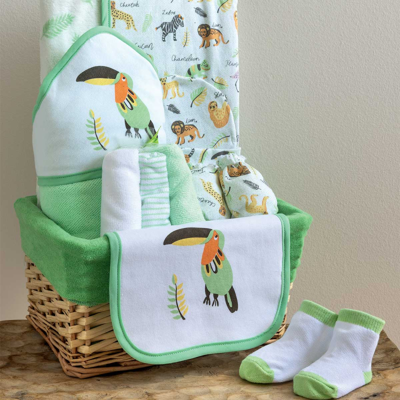 Βρεφικό σετ δώρου από την εταιρεία Palamaiki σε λευκό χρώμα με πράσινες λεπτομέρειες και σχέδιο με ζωάκια. Το σετ αποτελείται από 1 κουβέρτα fleece, 1 κάπα, 1 λαβέτα ώμου, 3 πανάκια ώμου, 1 σκουφάκι, 1 ζευγάρι γαντάκια, 1 ζευγάρι καλτσάκια, 1 σαλιάρα. Στο σετ περιλαμβάνεται και το καλάθι για να τα κάνετε δώρο.